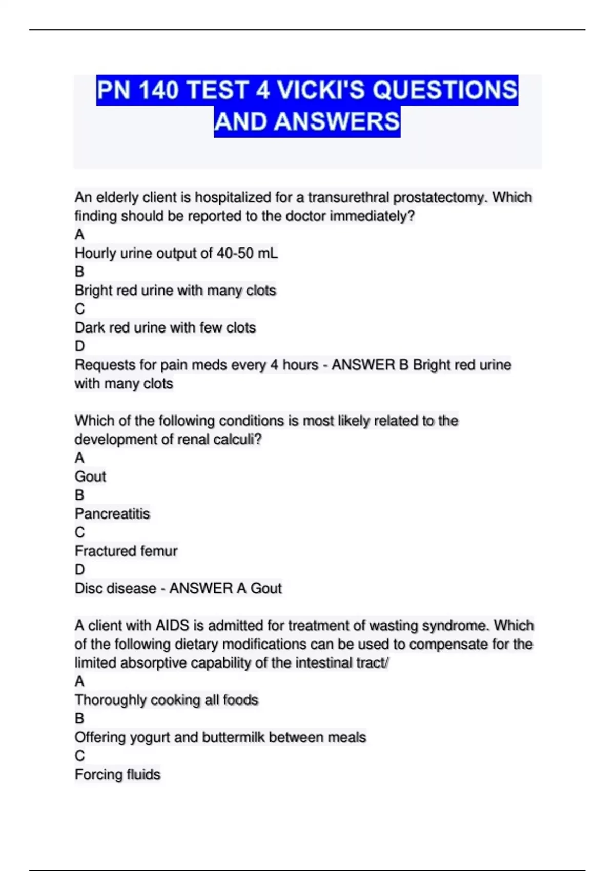 Requests for pain meds every 4 hours - ANSWER B Bright red urine