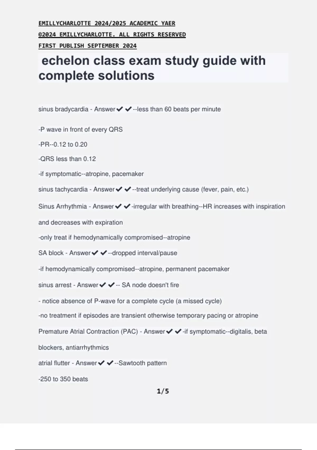 echelon class exam study guide with complete solutions sinus bradycardia - Answer--less than 60 beats per minute -P wave in front of every QRS -PR--0.12 to 0.20 -QRS less than 0.12 -if symptomatic--atropine, pacemaker sinus tachycardia - Answer--treat underlying cause (fever, pain, etc.) Sinus Arrhythmia - Answer-irregular with breathing--HR increases with inspiration and decreases with expiration -only treat if hemodynamically compromised--atropine SA block - Answer--dropped interval/pause -if hemodynamically compromised--atropine, permanent pacemaker sinus arrest - Answer-- SA node doesn't fire - notice absence of P-wave for a complete cycle (a missed cycle) -no treatment if episodes are transient otherwise temporary pacing or atropine Premature Atrial Contraction (PAC) - Answer-if symptomatic--digitalis, beta blockers, antiarrhythmics atrial flutter - Answer--Sawtooth pattern -250 to 350 beats EMILLYCHARLOTTE 2024/2025 ACADEMIC YAER ©2024 EMILLYCHARLOTTE. ALL RIGHTS RESERVED FIRST PUBLISH SEPTEMBER 2024 2/5 -PRI cant determine** -QRS less than .12 -need to control ventricular rate and convert the rhythm/anticoagulate a fib - Answer--no p wave -PRI cant measure** -QRS les than 0.12 -rate control and anti coag SVT - Answer--regular rate and rhythm -P wave not visible** -PRI 0.12-0.20** -QRS less than 0.12 -tx: vagal simulation -if stable--adenosine, calcium channel blockers, beta blockers, dig, antiarrhythmics -if unstable--cardioversion Premature Junctional Contraction - Answer--Inverted p wave or hidden p wave PRI0.12 or none Normal QRS -p wave goes down instead of up -no PRI unless P wave before QRS junctional escape rhythm - Answer--regular rhy