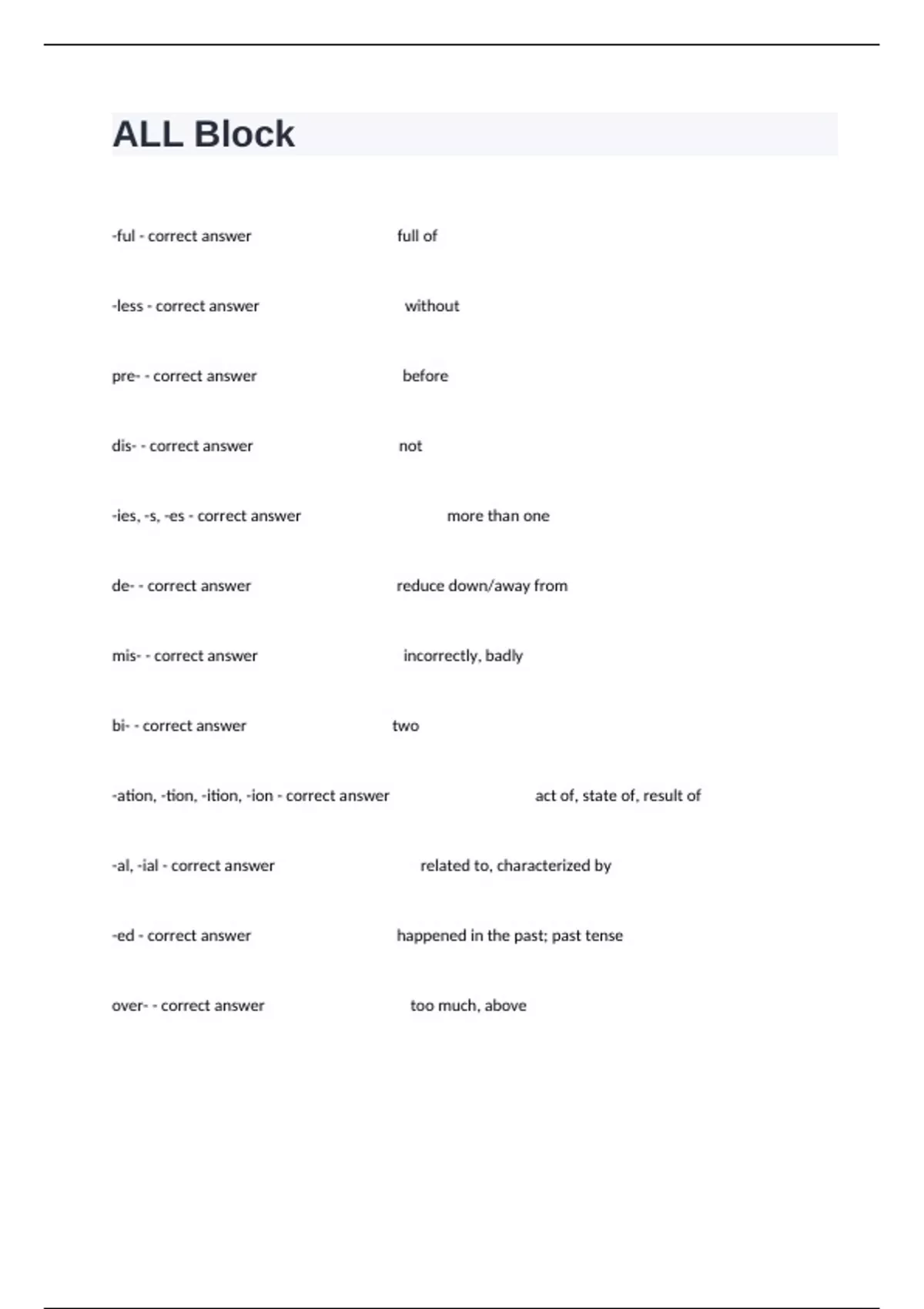-ation, -tion, -ition, -ion - correct answer act of, state of, result of
