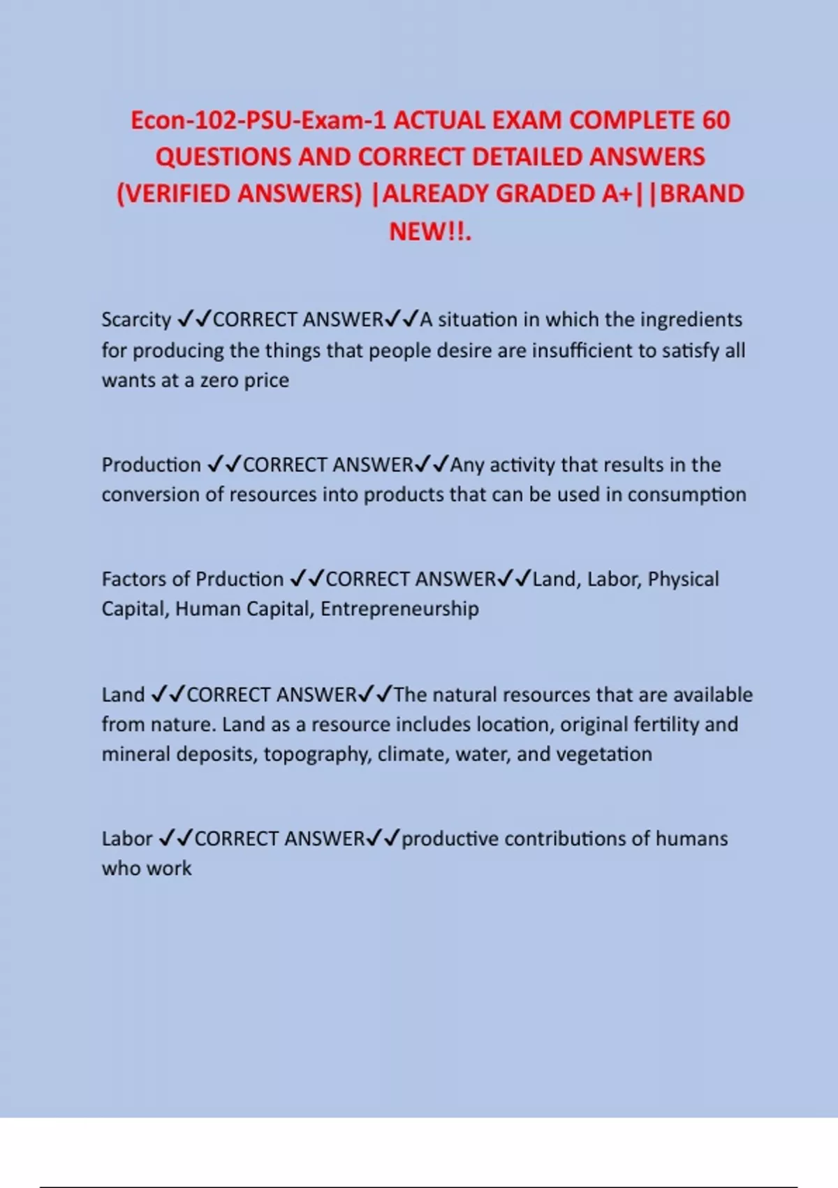 Factors of Prduction ✔✔CORRECT ANSWER✔✔Land, Labor, Physical