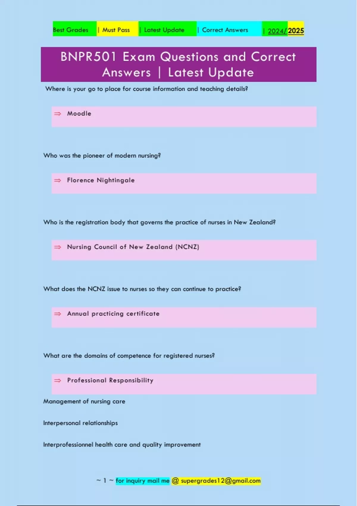 Where is your go to place for course information and teaching details?  Moodle Who was the pioneer of modern nursing?  Florence Nightingale Who is the registration body that governs the practice of nurses in New Zealand?  Nursing Council of New Zealand (NCNZ) What does the NCNZ issue to nurses so they can continue to practice?  Annual practicing certificate What are the domains of competence for registered nurses?  Professional Responsibility Management of nursing care Interpersonal relationships Interprofessionnel health care and quality improvement ~ 1 ~ for inquiry mail me @ Best Grades | Must Pass | Latest Update | Correct Answers | 2024/ 2025 Which one of these is a vision from the New Zealand health strategy (2015)?  Stay well What format must a document be uploaded to turn it in be?  Word document What is a current 2017/2018 health target?  Increased immunisation What type of healthcare is highly specialised and delivered over an extended period of time?  Tertiary What is not an academic sourc