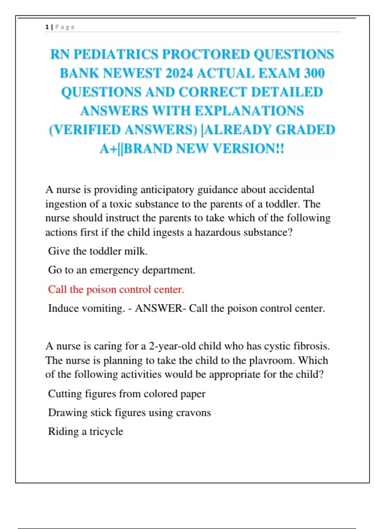 RN PEDIATRICS PROCTORED QUESTIONS BANK NEWEST 2024 ACTUAL EXAM 300 QUESTIONS AND CORRECT DETAILED ANSWERS WITH EXPLANATIONS (VERIFIED ANSWERS) |ALREADY GRADED A+||BRAND NEW VERSION!!