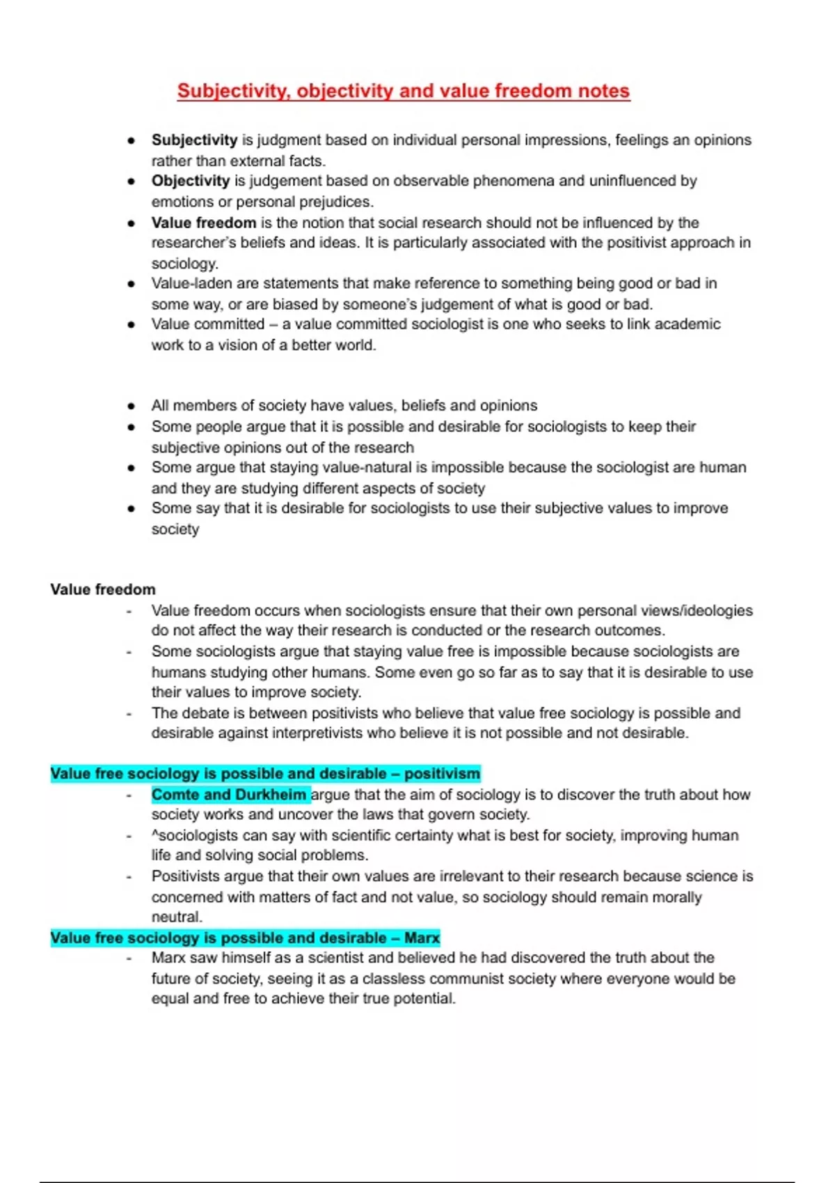 This document covers aqa sociology theory, methods, subjectivity, objectivity, and value freedom. THIS IS A TOPIC THAT HAS SO FAR NOT COME UP ON PAST EXAMS (POST 2024). these notes will aid well in preparing an answer to a question relevant to if sociology is value free nor not