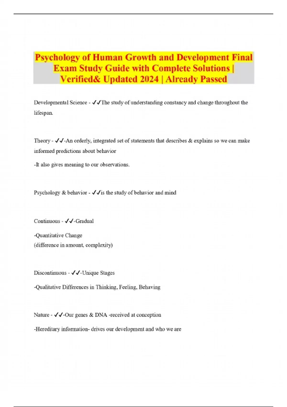 Psychology of Human Growth and Development Final Exam Study Guide with Complete Solutions | Verified& Updated 2024 | Already Passed