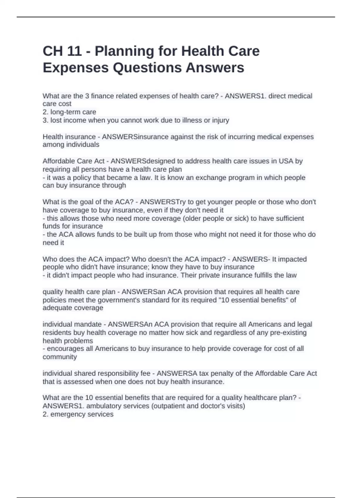 quality health care plan - ANSWERSan ACA provision that requires all health care
