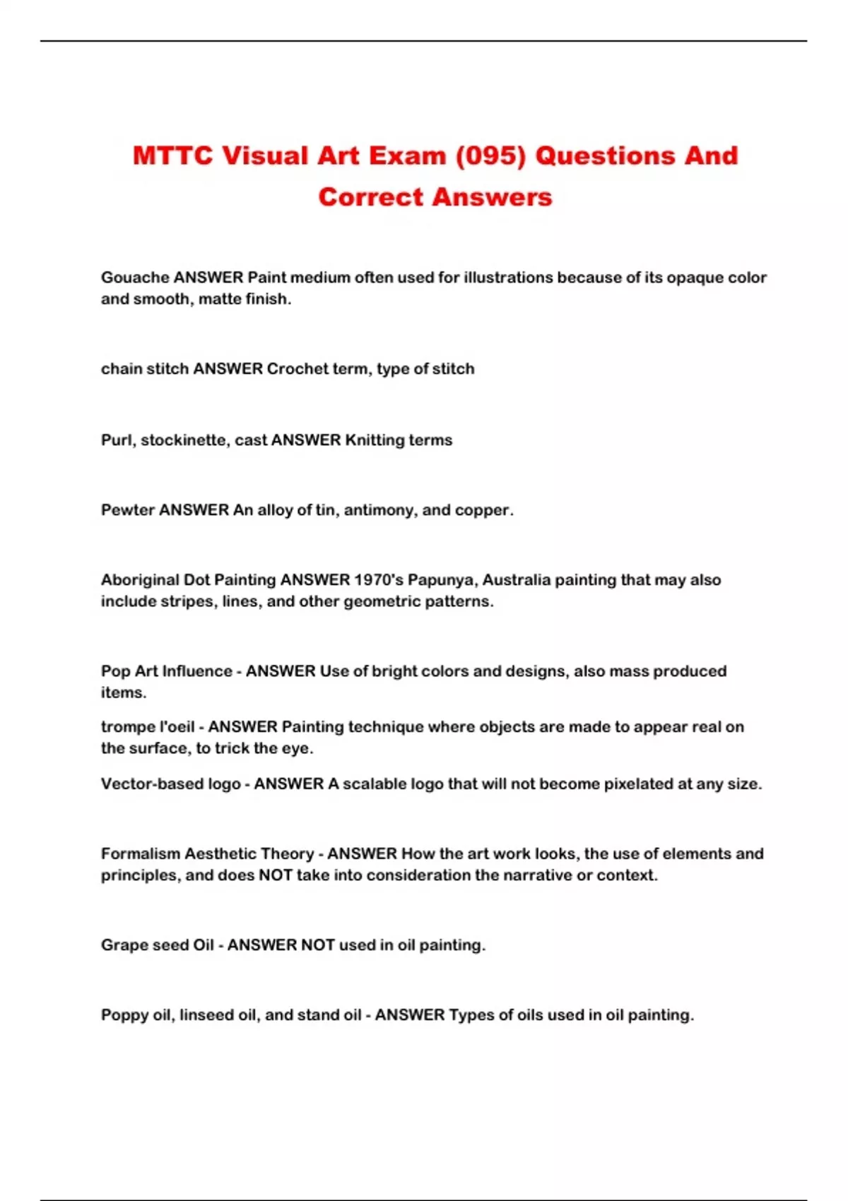 MTTC Visual Art Exam (095) Questions And