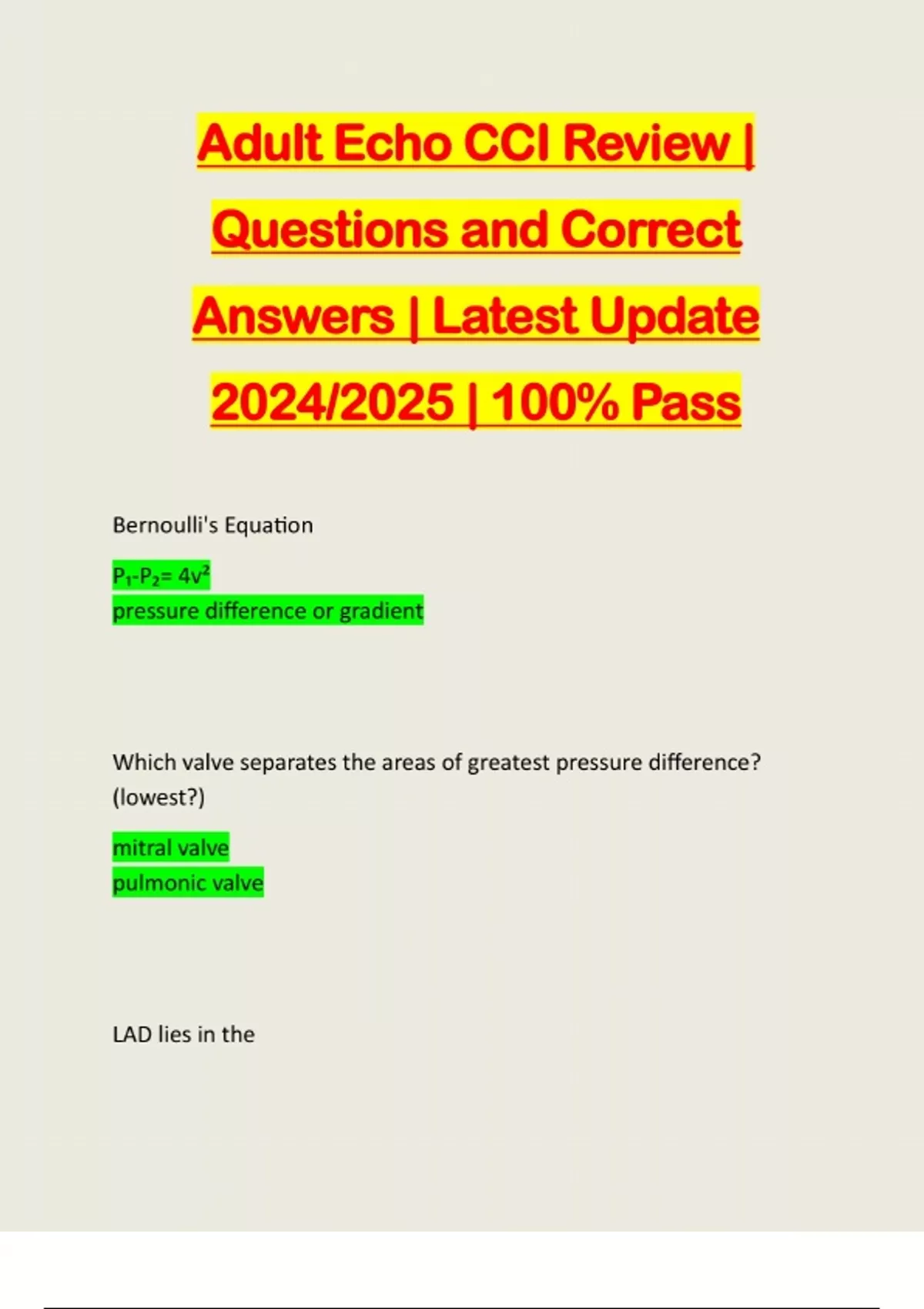 Adult Echo CCI Review | Questions and Correct Answers | Latest Update 2024/2025 | 100% Pass Bernoulli's Equation P₁-P₂= 4v² pressure difference or gradient Which valve separates the areas of greatest pressure difference? (lowest?) mitral valve pulmonic valve LAD lies in theanterior interventricular groove (sulcus) Which aortic leaflet is the superior one in psla? right leaflet noncoronary (posterior) From the left parasternal window which of the following are you most likely to get accurate velocity measurements? pulmonary artery (parallel) Name the tricuspid leaflets