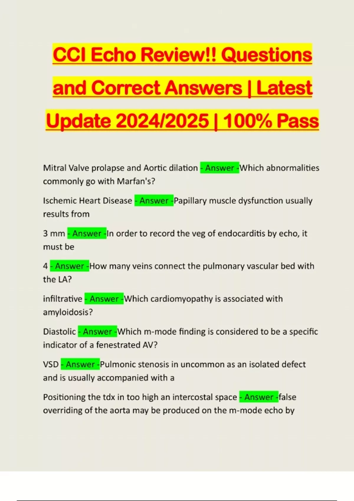 CCI Echo Review!! Questions and Correct Answers | Latest Update 2024/2025 | 100% Pass Mitral Valve prolapse and Aortic dilation - Answer -Which abnormalities commonly go with Marfan's? Ischemic Heart Disease - Answer -Papillary muscle dysfunction usually results from 3 mm - Answer -In order to record the veg of endocarditis by echo, it must be 4 - Answer -How many veins connect the pulmonary vascular bed with the LA? infiltrative - Answer -Which cardiomyopathy is associated with amyloidosis? Diastolic - Answer -Which m-mode finding is considered to be a specific indicator of a fenestrated AV? VSD - Answer -Pulmonic stenosis in uncommon as an isolated defect and is usually accompanied with a Positioning the tdx in too high an intercostal space - Answer -false overriding of the aorta may be produced on the m-mode echo byrheumatic mitral stenosis - Answer -A fib is most common with what valvular disease bovine, equine, or porcine valve - Answer -Example of a bioprosthetic pericardial effusion may not be present - Answer -When a patient has a clinical diagnosis of pericarditis less than 0.06 seconds after MV closure - Answer -TV closure usually occurs coronary artery aneurysm - Answer -Ka