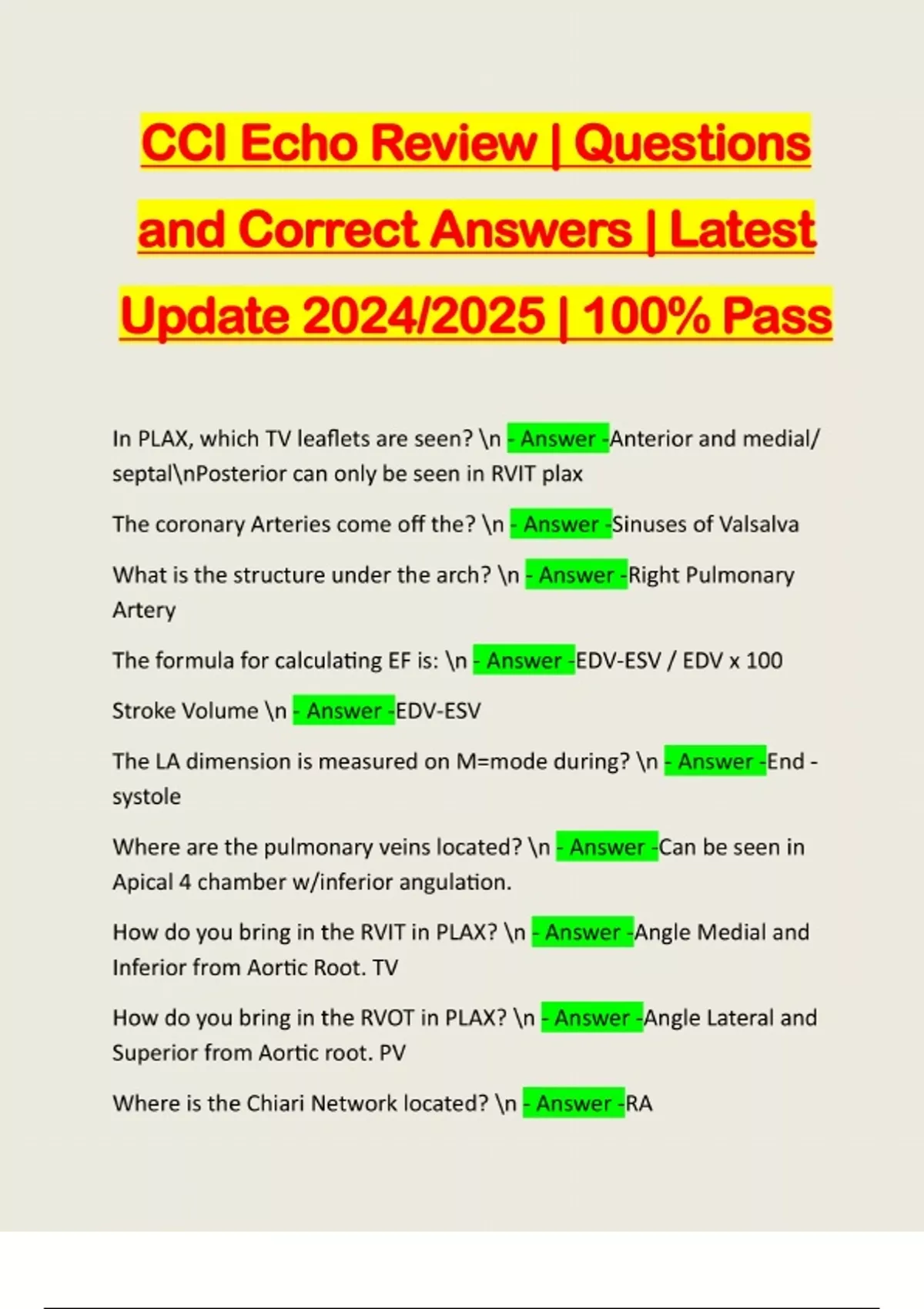 CCI Echo Review | Questions and Correct Answers | Latest Update 2024/2025 | 100% Pass In PLAX, which TV leaflets are seen? n - Answer -Anterior and medial/ septalnPosterior can only be seen in RVIT plax The coronary Arteries come off the? n - Answer -Sinuses of Valsalva What is the structure under the arch? n - Answer -Right Pulmonary Artery The formula for calculating EF is: n - Answer -EDV-ESV / EDV x 100 Stroke Volume n - Answer -EDV-ESV The LA dimension is measured on M=mode during? n - Answer -End - systole Where are the pulmonary veins located? n - Answer -Can be seen in Apical 4 chamber w/inferior angulation. How do you bring in the RVIT in PLAX? n - Answer -Angle Medial and Inferior from Aortic Root. TV How do you bring in the RVOT in PLAX? n - Answer -Angle Lateral and Superior from Aortic root. PV Where is the Chiari Network located? n - Answer -RAWhere is the aortic isthmus located? n - Answer -Area between the le