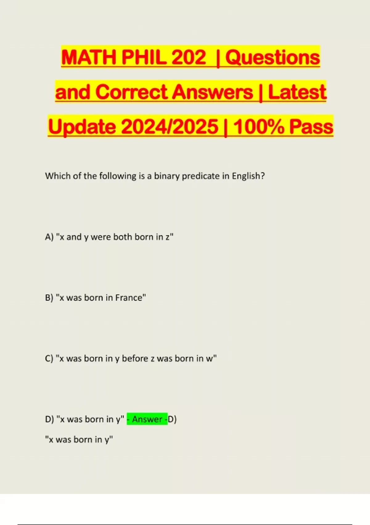MATH PHIL 202 | Questions and Correct Answers | Latest Update 2024/2025 | 100% Pass Which of the following is a binary predicate in English? A) "x and y were both born in z" B) "x was born in France" C) "x was born in y before z was born in w" D) "x was born in y" - Answer -D) "x was born in y"Which of the following is not true about individual constants in FOL? A) All objects must be named by at least one individual constant. B) No individual constant can name more than one object. C)