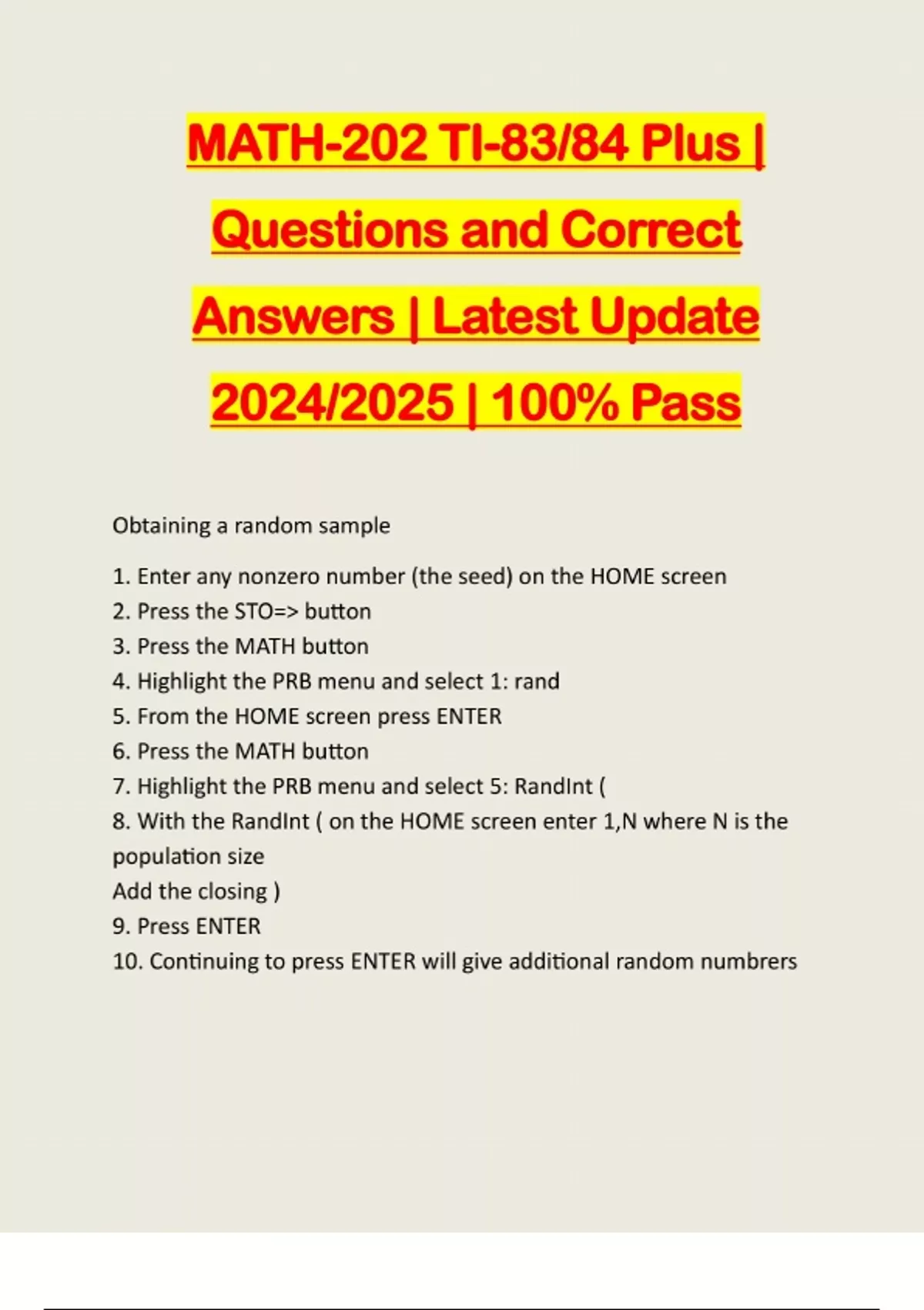 MATH-202 TI-83/84 Plus | Questions and Correct Answers | Latest Update 2024/2025 | 100% Pass Obtaining a random sample 1. Enter any nonzero number (the seed) on the HOME screen 2. Press the STO=> button 3. Press the MATH button 4. Highlight the PRB menu and select 1: rand 5. From the HOME screen press ENTER 6. Press the MATH button 7. Highlight the PRB menu and select 5: RandInt ( 8. With the RandInt ( on the HOME screen enter 1,N where N is the population size