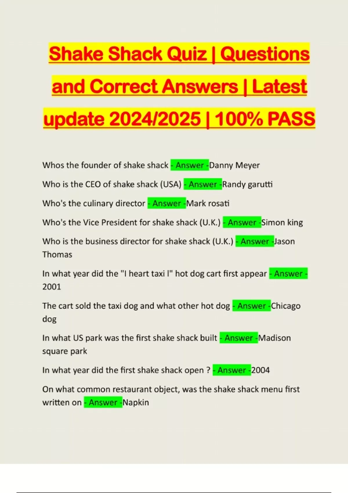 Shake Shack Quiz | Questions and Correct Answers | Latest update 2024/2025 | 100% PASS Whos the founder of shake shack - Answer -Danny Meyer Who is the CEO of shake shack (USA) - Answer -Randy garutti Who's the culinary director - Answer -Mark rosati Who's the Vice President for shake shack (U.K.) - Answer -Simon king Who is the business director for shake shack (U.K.) - Answer -Jason Thomas In what year did the "I heart taxi l" hot dog cart first appear - Answer - 2001 The cart sold the taxi dog and what other hot dog - Answer -Chicago dog In what US park was the first shake shack built - Answer -Madison square park In what year did the fi