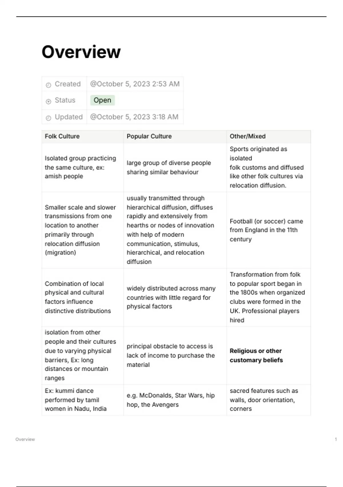 the same culture, ex: folk customs and diffused