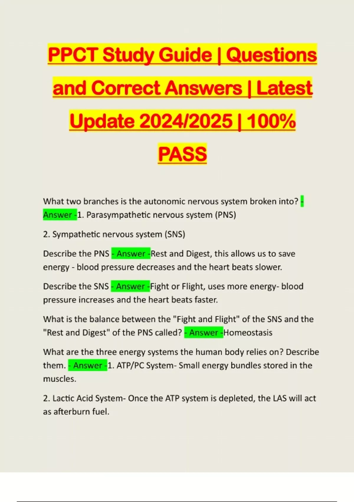 PPCT Study Guide | Questions and Correct Answers | Latest Update 2024/2025 | 100% PASS What two branches is the autonomic nervous system broken into? - Answer -1. Parasympathetic nervous system (PNS) 2. Sympathetic nervous system (SNS) Describe the PNS - Answer -Rest and Digest, this allows us to save energy - blood pressure decreases and the heart beats slower. Describe the SNS - Answer -Fight or Flight, uses more energy- blood pressure increases and the heart beats faster. What is the balance between the "Fight and Flight" of the SNS and the "Rest and Digest" of the PNS called? - Answer -Homeostasis What are the three energy systems the human body relies on? Describe them. - Answer -1. ATP/PC System- Small energy bundles stored in the muscles. 2. Lactic Acid System- Once the ATP system is depleted, the LAS will act as afterburn fuel.3. Aerobic System- Once the LAS is depleted, the AS becomes the final dominant fuel system. What are the three Components of Acceptability that contribute to the philosophy of PPCT? - Answer -1. Tactical 2. Legal