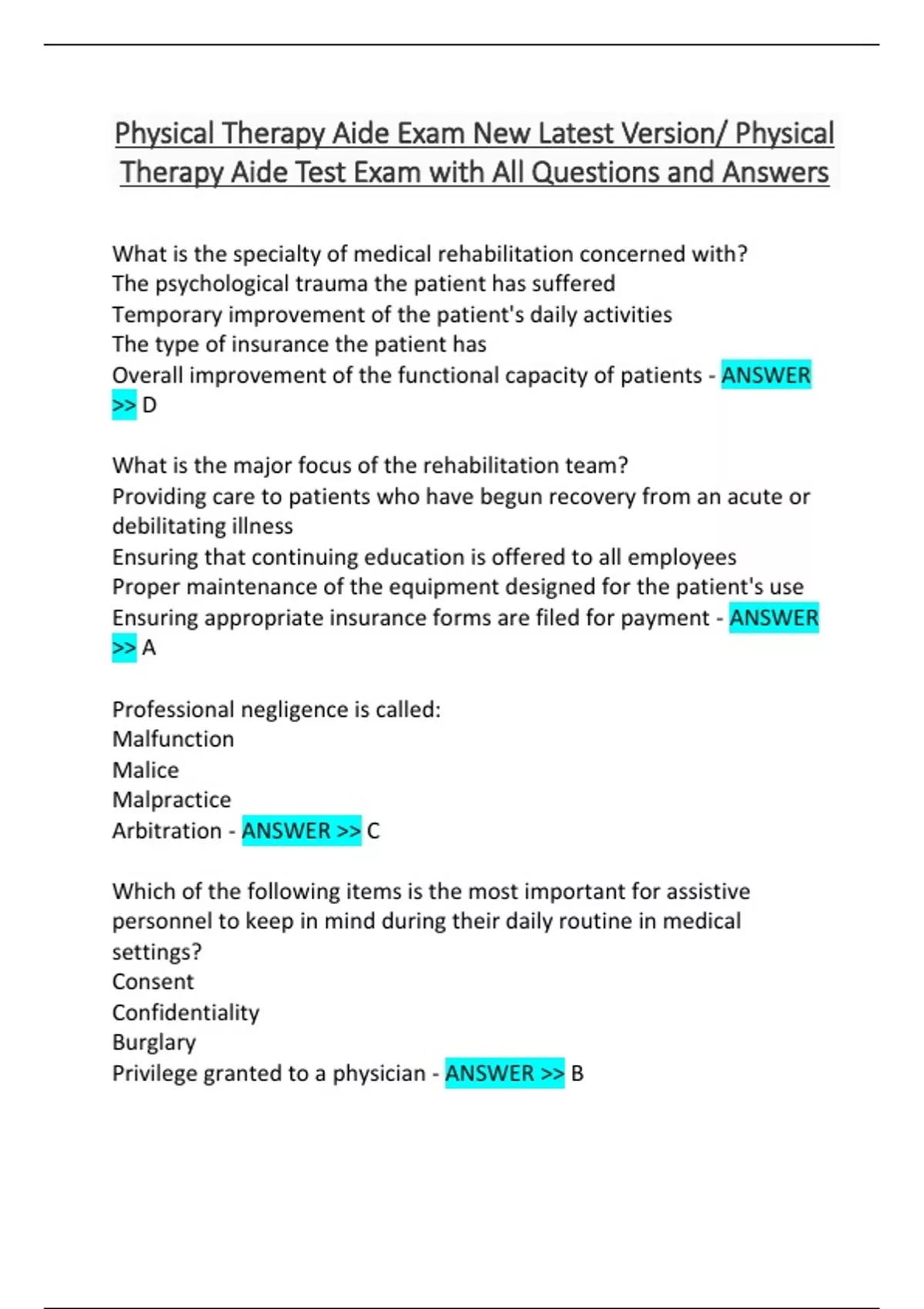 Physical Therapy Aide Exam New Latest Version/ Physical