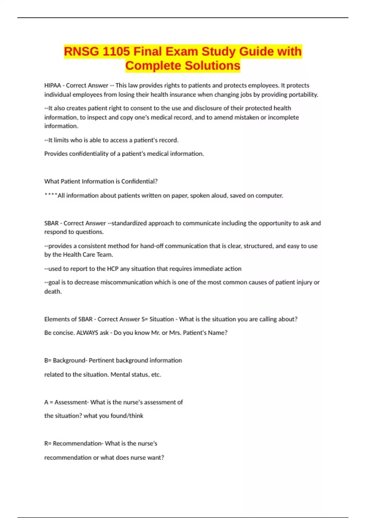 RNSG 1105 Final Exam Study Guide with Complete Solutions HIPAA - Correct Answer -- This law provides rights to patients and protects employees. It protects individual employees from losing their health insurance when changing jobs by providing portability. --It also creates patient right to consent to the use and disclosure of their protected health information, to inspect and copy one's medical record, and to amend mistaken or incomplete information. --It limits who is able to access a patient's record. Provides confidentiality of a patient's medical information. What Patient Information is Confidential? ****All information about patients written on paper, spoken aloud, saved on computer. SBAR - Correct Answer --standardized approach to communicate including the opportunity to ask and respond to questions. --provides a consistent method for hand-off communication that is clear, structured, and easy to use by the Health Care Team. --used to report to the HCP any situation that requires immediate action --goal is to decrease miscommunication which is one of the most common causes of patient injury or death. Elements of SBAR - Correct Answer S= Situation - What is the situation you are calling about? Be concise. ALWAYS ask - Do you know Mr. or Mrs. Patient's Name? B= Background- Pertinent background information related to the situation. Mental status, etc. A = Assessment- What is the nurse's assessment of the situation? what you found/think R= Recommendation- What is the nurse's recommendation or what does n