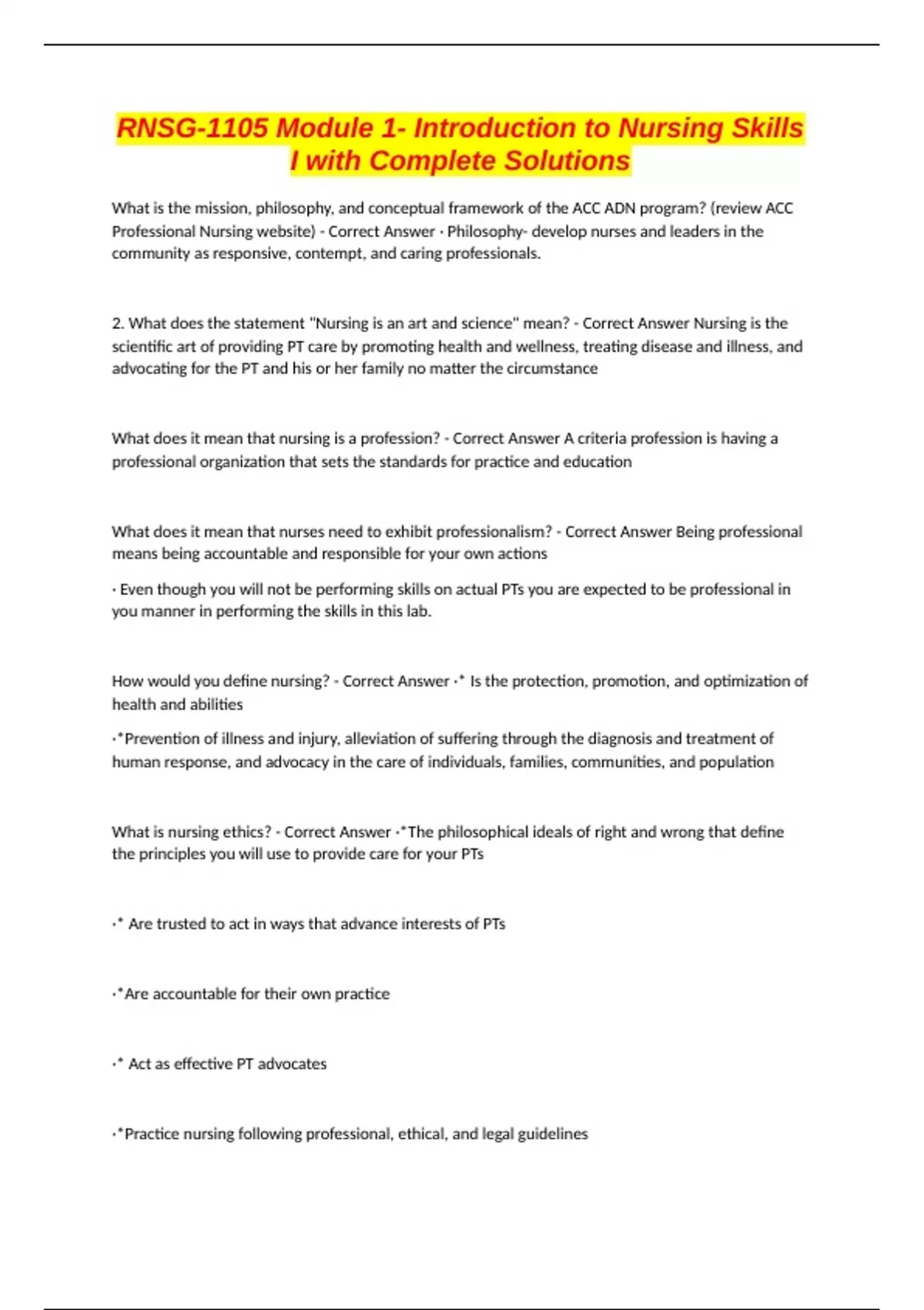 RNSG-1105 Module 1- Introduction to Nursing Skills I with Complete Solutions What is the mission, philosophy, and conceptual framework of the ACC ADN program? (review ACC Professional Nursing website) - Correct Answer · Philosophy- develop nurses and leaders in the community as responsive, contempt, and caring professionals. 2. What does the statement "Nursing is an art and science" mean? - Correct Answer Nursing is the scientific art of providing PT care by promoting health and wellness, treating disease and illness, and advocating for the PT and his or her family no matter the circumstance What does it mean that nursing is a profession? - Correct Answer A criteria profession is having a professional organization that sets the standards for practice and education What does it mean that nurses need to exhibit professionalism? - Correct Answer Being professional means being accountable and responsible for your own actions · Even though you will not be performing skills on actual PTs you are expected to be professional in you manner in performing the skills in this lab. How would you define nursing? - Correct Answer ·* Is the protection, promotion, and optimization of health and abilities ·*Prevention of illness and injury, alleviation of suffering through the diagnosis and treatment of human response, and advocacy in the care of individuals, families, communities, and population What is nursing ethics? - Correct Answer ·*The philosophical ideals of right and wrong that define the principles you will use to provide care for your PTs ·* Are trusted to act in ways that advance interests of PTs ·*Are accountable for their own practice ·* Act as effective PT advocates ·*Practice nursing following professional, ethical, and legal guidelines What is the purpose of the nursing code of ethics? - Correct Answer ·* Code of ethics are presented as general statem