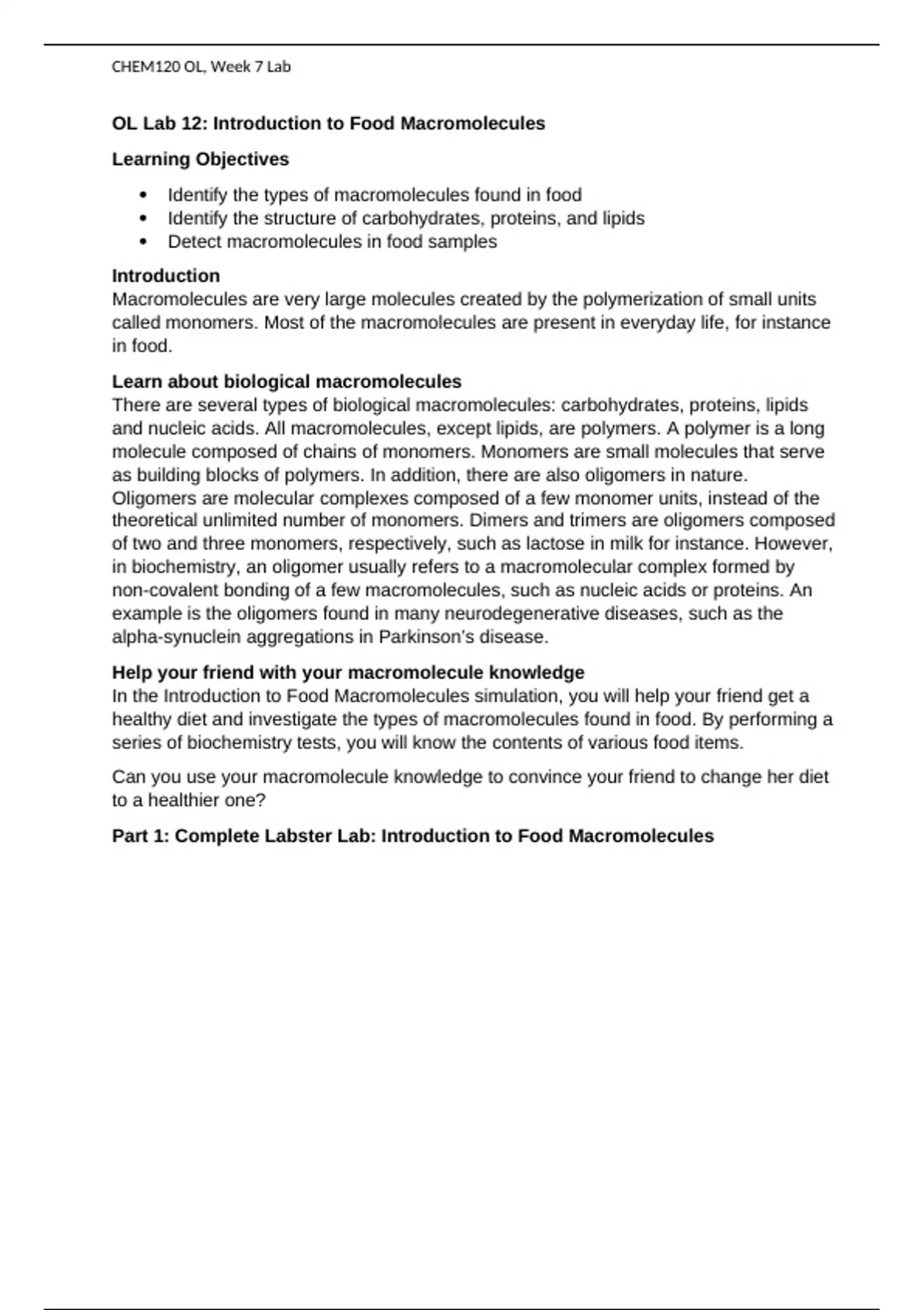 Part 1: Complete Labster Lab: Introduction to Food Macromolecules
