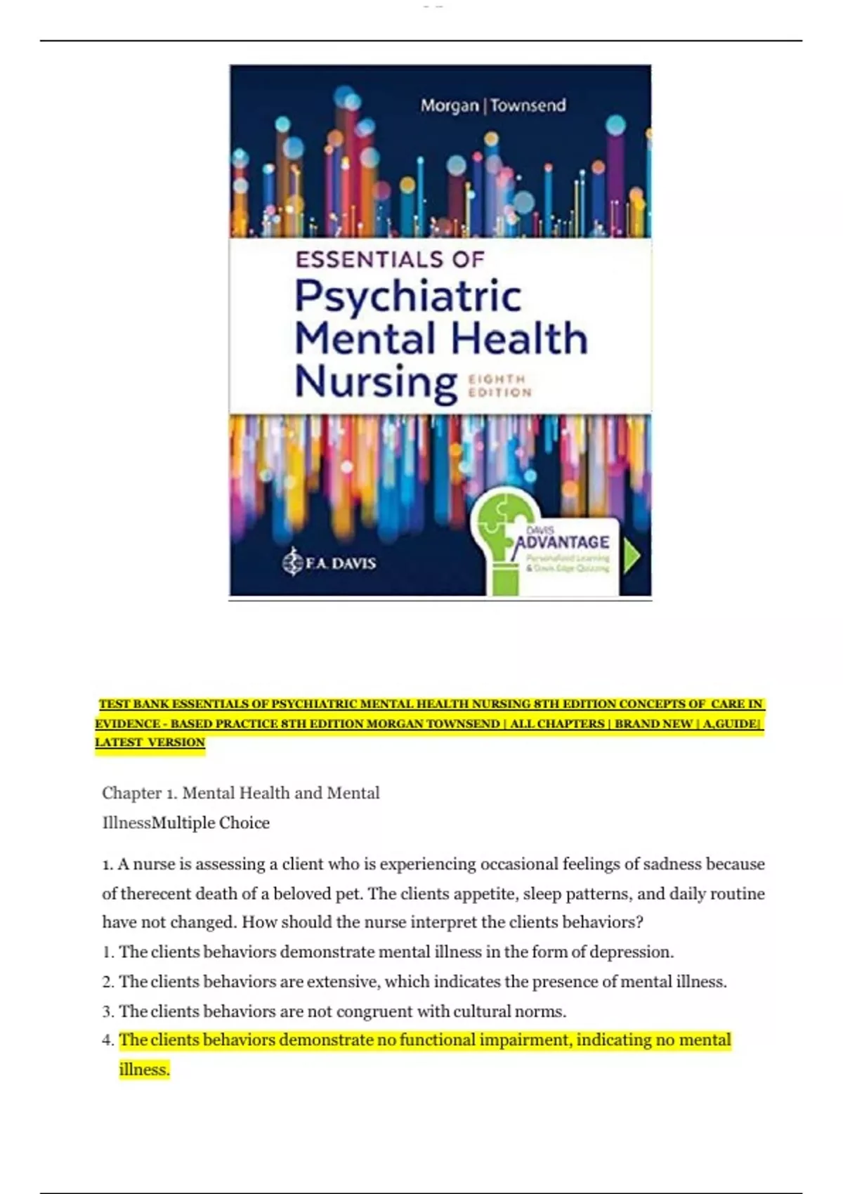 TEST BANK ESSENTIALS OF PSYCHIATRIC MENTAL HEALTH NURSING 8TH EDITION CONCEPTS OF CARE IN EVIDENCE - BASED PRACTICE 8TH EDITION MORGAN TOWNSEND | ALL CHAPTERS | BRAND NEW | A,GUIDE| LATEST VERSION Chapter 1. Mental Health and Mental IllnessMultiple Choice 1. A nurse is assessing a client who is experiencing occasional feelings of sadness because of therecent death of a beloved pet. The clients appetite, sleep patterns, and daily routine have not changed. How should the nurse interpret the clients behaviors? 1. The clients behaviors demonstrate mental illness in the form of depression. 2. The clients behaviors are extensive, which indicates the presence of mental illness. 3. The clients behaviors are not congruent with cultural norms. 4. The clients behaviors demonstrate no functional impairment, indicating no mental illness. ANS: 4 Rationale: The nurse should assess that the clients daily functioning is not impaired. The clientwho experiences feelings of sadness after the loss of a pet is responding within
