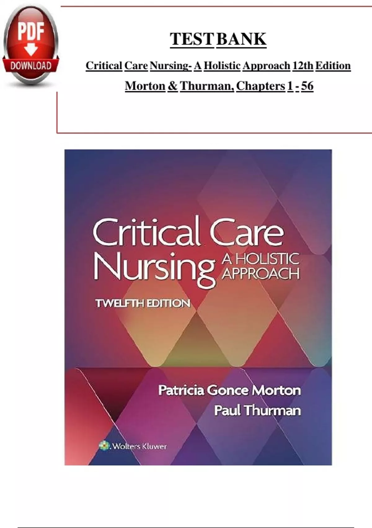 TEST BANK For Critical Care Nursing- A Holistic Approach, 12th Edition by Morton Fontaine, Verified Chapters 1 - 56, Complete Newest Version