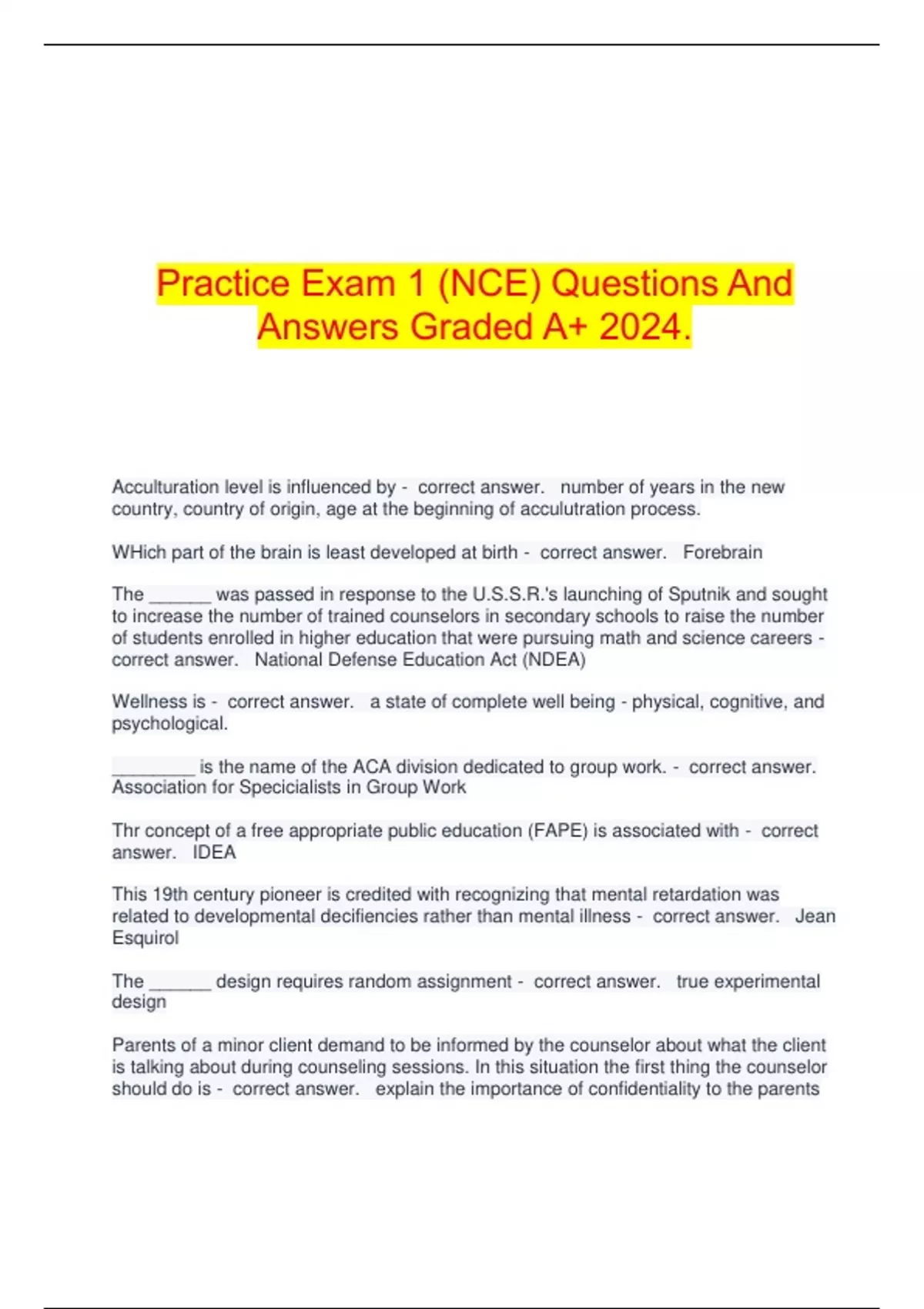Practice Exam 1 (NCE) Questions And Answers Graded A+ 2024.