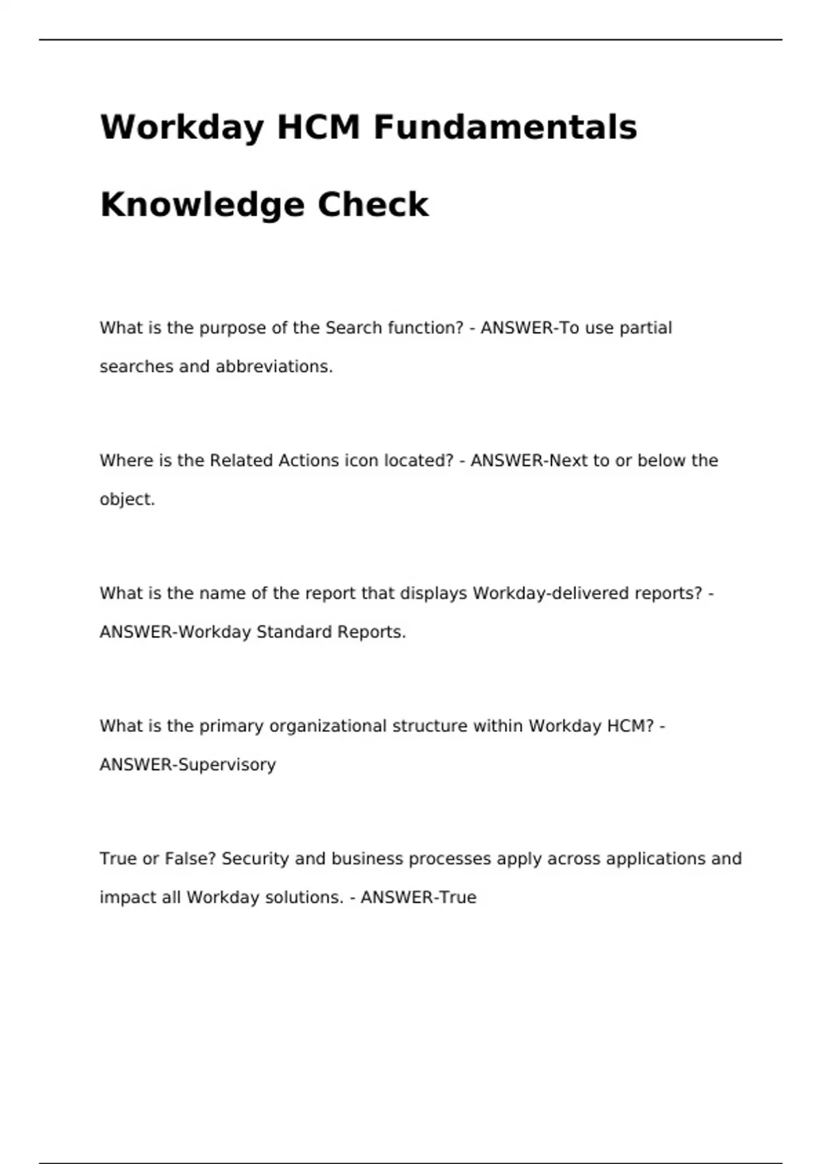 Workday HCM Fundamentals Knowledge CheckWorkday HCM Fundamentals Knowledge CheckWorkday HCM Fundamentals Knowledge CheckWorkday HCM Fundamentals Knowledge CheckWorkday HCM Fundamentals Knowledge CheckWhat is the purpose of the Search function? - ANSWER-To use partial searches and abbreviations. Where is the Related Actions icon located? - ANSWER-Next to or below the object.