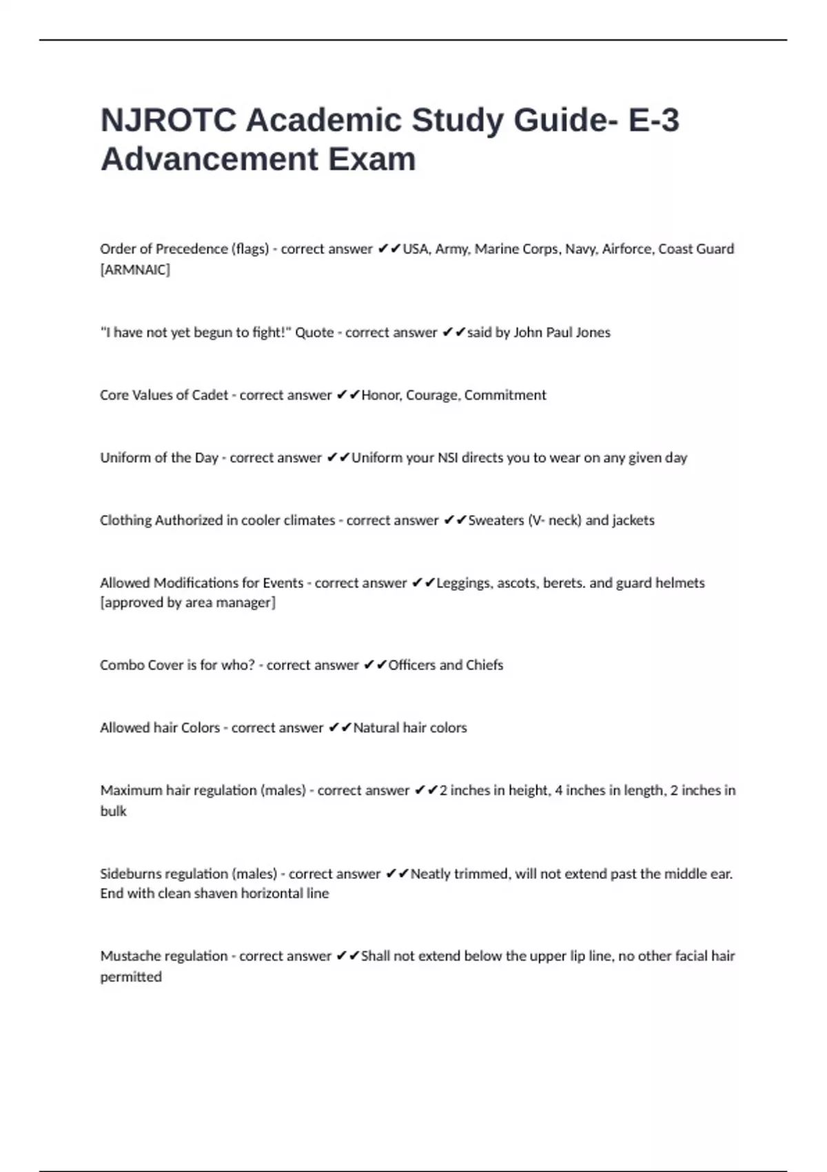 Sideburns regulation (males) - correct answer ✔✔Neatly trimmed, will not extend past the middle ear.