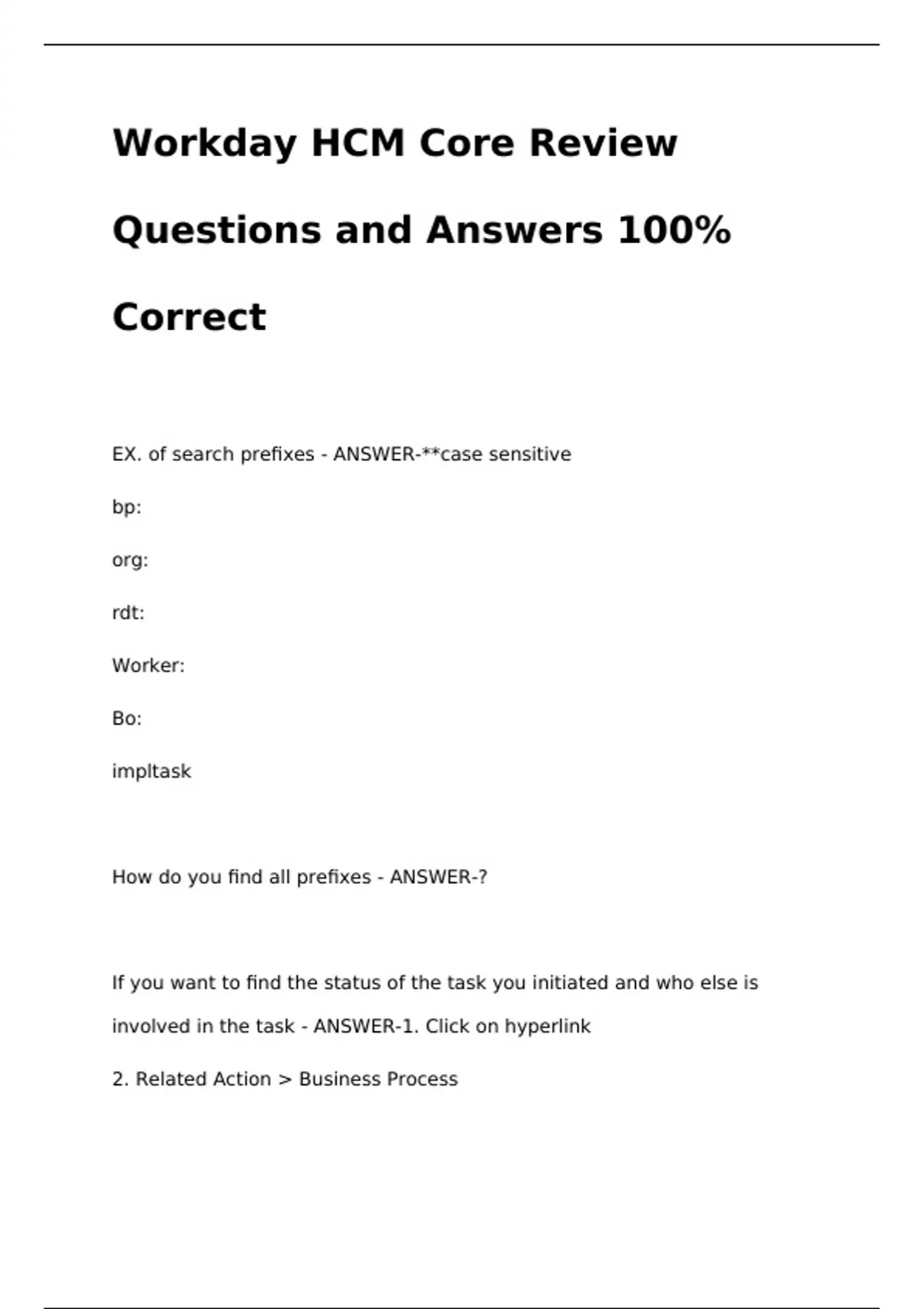 Workday HCM Core Review Questions and Answers 100% CorrectWorkday HCM Core Review Questions and Answers 100% CorrectWorkday HCM Core Review Questions and Answers 100% CorrectWorkday HCM Core Review Questions and Answers 100% CorrectWorkday HCM Core Review Questions and Answers 100% CorrectEX. of search prefixes - ANSWER-**case sensitive bp: org: rdt: Worker: Bo: impltask How do you find all prefixes - ANSWER-? If you want to find the status of the task you initiated and who else is involved in the task - ANSWER-1. Click on hyperlink 2. Related Action > Business Process 3. Or go to Inbox