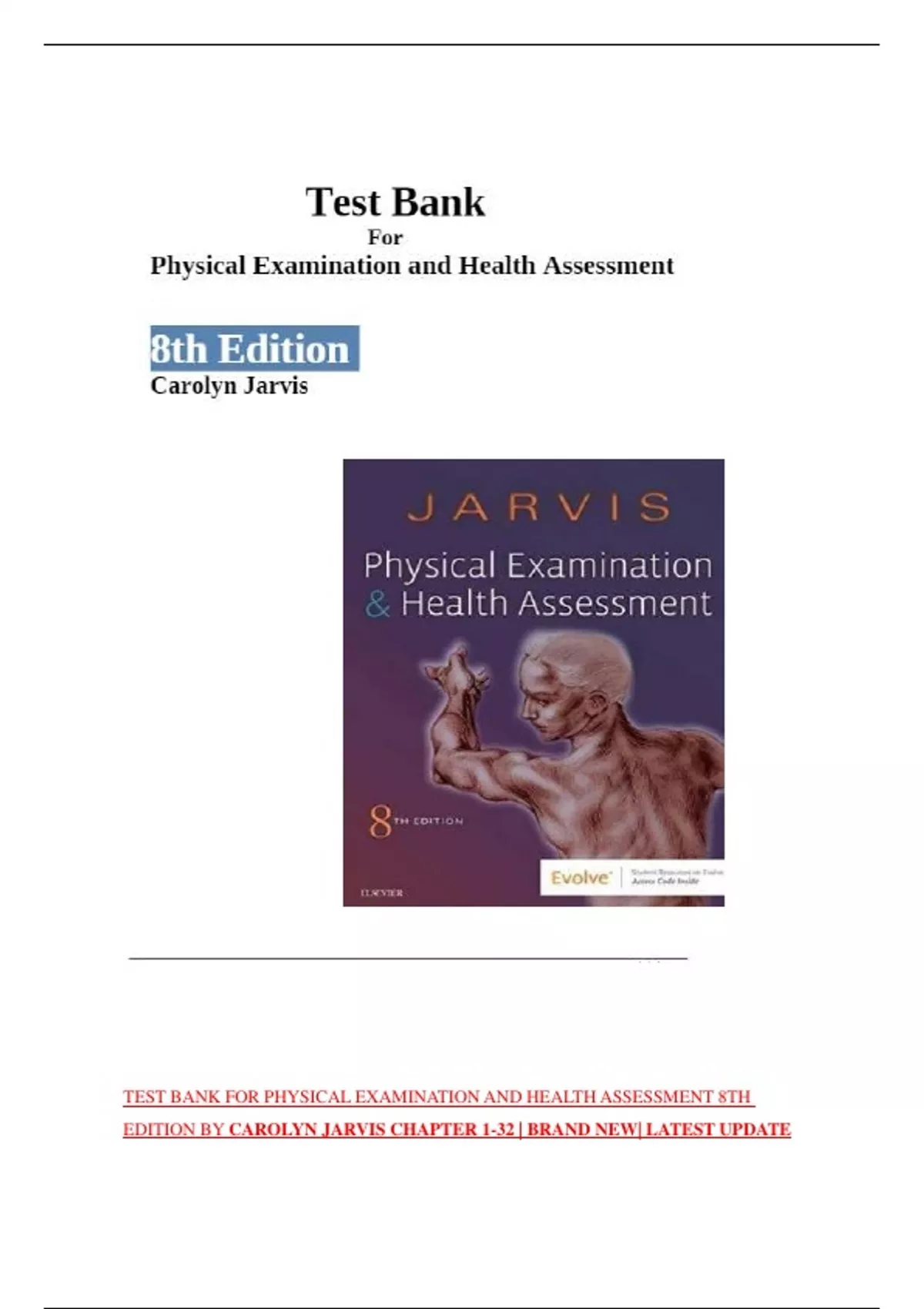 TEST BANK FOR PHYSICAL EXAMINATION AND HEALTH ASSESSMENT 8TH EDITION BY CAROLYN JARVIS CHAPTER 1-32 | BRAND NEW| LATEST UPDATE