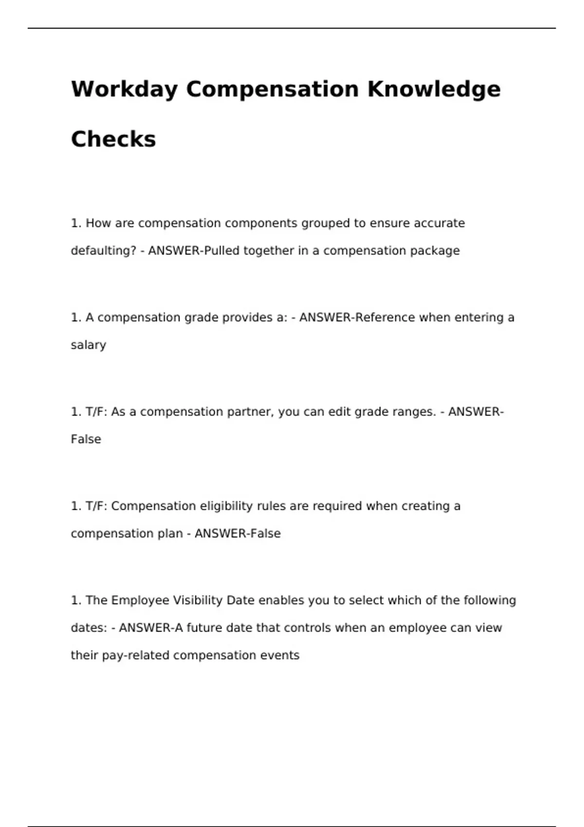 vWorkday Compensation Knowledge ChecksWorkday Compensation Knowledge ChecksWorkday Compensation Knowledge ChecksWorkday Compensation Knowledge ChecksWorkday Compensation Knowledge Checks 1. How are compensation components grouped to ensure accurate defaulting? - ANSWER-Pulled together in a compensation package 1. A compensation grade provides a: - ANSWER-Reference when entering a salary 1. T/F: As a compensation partner, you can edit grade ranges. - ANSWER-False 1. T/F: Compensation eligibility rules are required when creating a