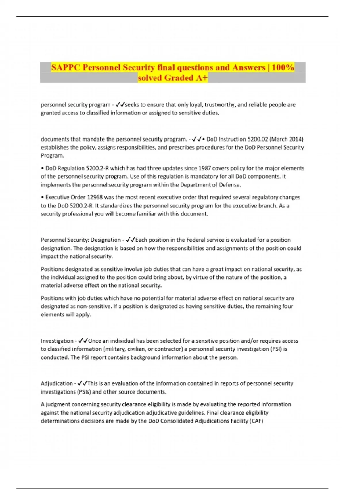 SAPPC Personnel Security final questions and Answers | 100% solved Graded A+