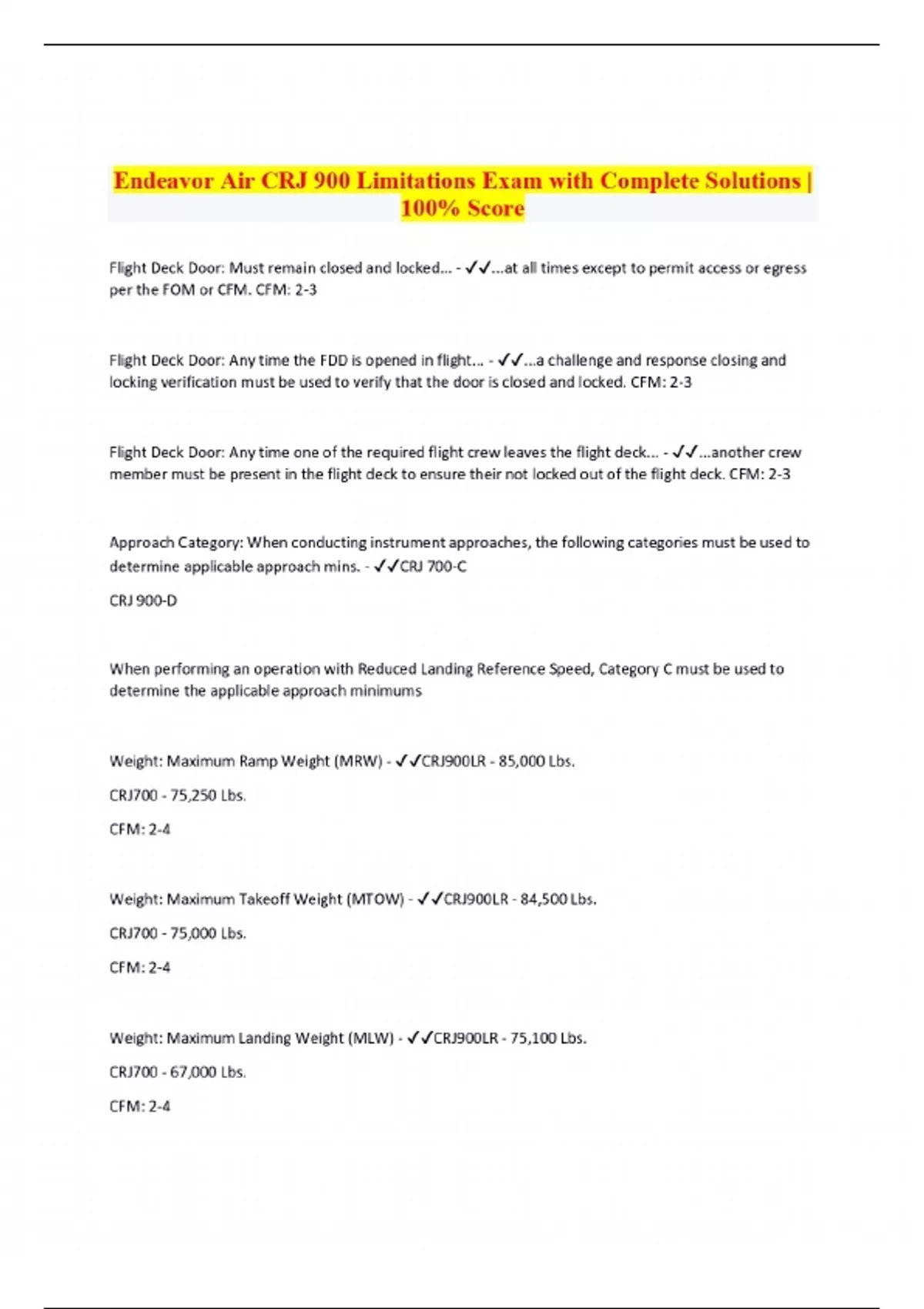 Endeavor Air CRJ 900 Limitations Exam with Complete Solutions | 100% Score