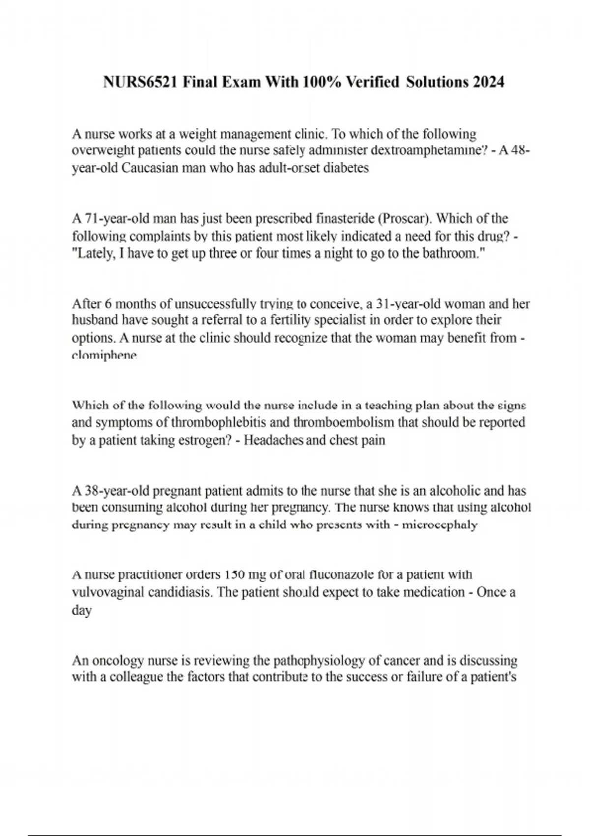 A nurse works at a weight management clinic. To which of the following overweight patients could the nurse safely administer dextroamphetamine? - A 48- year-old Caucasian man who has adult-onset diabetes A 71-year-old man has just been prescribed finasteride (Proscar). Which of the following complaints by this patient most likely indicated a need for this drug? - "Lately, I have to get up three or four times a night to go to the bathroom." After 6 months of unsuccessfully trying to conceive, a 31-year-old woman and her husband have sought a referral to a fertility specialist in order to explore their options. A nurse at the clinic should recognize that the woman may benefit from - clomiphene. Which of the following would the nurse include in a teaching plan about the signs and symptoms of thrombophlebitis and thromboembolism that should be reported by a patient taking estrogen? - Headaches and chest pain A 38-year-old pregnant patient admits to the nurse that she is an alcoholic and has been consuming alcohol during her pregnancy. The nurse knows that using alcohol during pregnancy may result in a child who presents with - microcephaly A nurse practitioner orders 150 mg of oral fluconazole for a patient with vulvovaginal candidiasis. The patient should expect to take medication - Once a day An oncology nurse is reviewing the pathophysiology of cancer and is discussing with a colleague the factors that contribute to the success or failure of a patient's chemotherapy. Which of the following cancerous cells is most susceptible to the effects of chemotherapeutic drugs? - Cells that have a rapid mitotic rate A middle-aged patient has received a diagnosis of GI stromal tumor following an extensive diagnostic workup. Imatinib has been recommended as a component of the patient's drug regimen. What patient education should the nurse provide to this patient? "It's important that you let us know if you develop any significant swelling or - Puffiness A 12-year-old boy is being discharged from the hospital after major surgery. The boy will be taking two medications at home for an extended period. The nurse who is discharging the patient should provide medication teaching specifically to - both the boy and his mother regarding all medication issued. A patient has been admitted to the critical care unit with a diagnosis of peritonitis that has necessitated treatment with gentamicin. As a result, the care team should be cautious when concurrently administering other medications that may cause - ototoxicity or nephrotoxicity A 39-year-old woman is receiving doxorubicin for the treatment of cancer. After each treatment, the patient has acute nausea and vomiting accompanied by a slightly increased heart rate. The nurse will advise her to - perform relaxation techniques after the treatments. A nurse is caring for a patient with cancer who has been prescribed dronabinol (Marinol) to help reduce nausea and vomiting from chemotherapy. The nurse will inform the patient that he or she is taking an oral form of - marijuana A 46-year-old man is receiving a quinupristindalfopristin IV infusion for a lifethreatening infection. Which of the following would be most important for the nurse to monitor? - Infiltration, edema, or phlebitis at the infusion site A woman is receiving prolonged drug therapy during her complicated pregnancy, and it may pose a risk to both the mother and the fetus. The primary care physician has made dosage adjustments to minimize adverse effects and prevent toxicity. - The nurse should make sure that serum levels of the drug are being monitored Alprostadil (Caverject), a drug used to treat erectile dysfunction, has been prescribed to a 42- year-old patient. When providing education to the patient and his wife, the nurse should inform the wife about which of the following adverse effects? - Vaginal burning A 36-year-old patient comes to the clinic and tells the nurse that she suspects that she is pregnant. During the initial assessment, the nurse learns that the patient is currently taking medications for diabetes, hypertension, and a seizure disorder. The nurse would be most concerned about which of the following medications? - Phenytoin (Dilantin) A male patient with a medical background tells the nurse that he is not satisfied with the oral synthetic testosterone that has been prescribed for him and he would like to try a natural form of oral testosterone. Which of the following would be an appropriate response by the nurse? - "Natural testosterone undergoes a high first-pass effect and is not used orally." A male patient is trying to decide if he should use finasteride (Proscar) to treat benign prostatic hypertrophy (BPH). When providing information about the drug, the nurse will include which of the following as a risk associated with finasteride therapy? - Prostatic neoplasia A 2-year-old child is diagnosed with a minor ailment and is to be administered medications at home for 2 weeks. The child lives with his mother, grandmother, and four other children between the ages of 14 months and 7 years. The home health nurse is asked to assess the home environment to determine if it is appropriate for the child to take his medication at home. Which of the following will have the greatest impact on the nurse's assessment? - Where the medications will be stored A 22-year-old woman has given birth to an infant who exhibits the signs and symptoms of maternal cocaine use during pregnancy. These signs and symptoms are a result of what pathophysiological effect of opioid use during pregnancy? - Vasoconstriction leading to reduced placental blood flow A 62-year-old patient taking tamoxifen exhibits increased bone and tumor pain along with a local disease flare. The nurse interprets this as an indication of which of the following? - The tumor responding to treatment A 6-month-old child has developed skin irritation due to an allergic reaction. He has been prescribed a topical skin ointment. The nurse wil