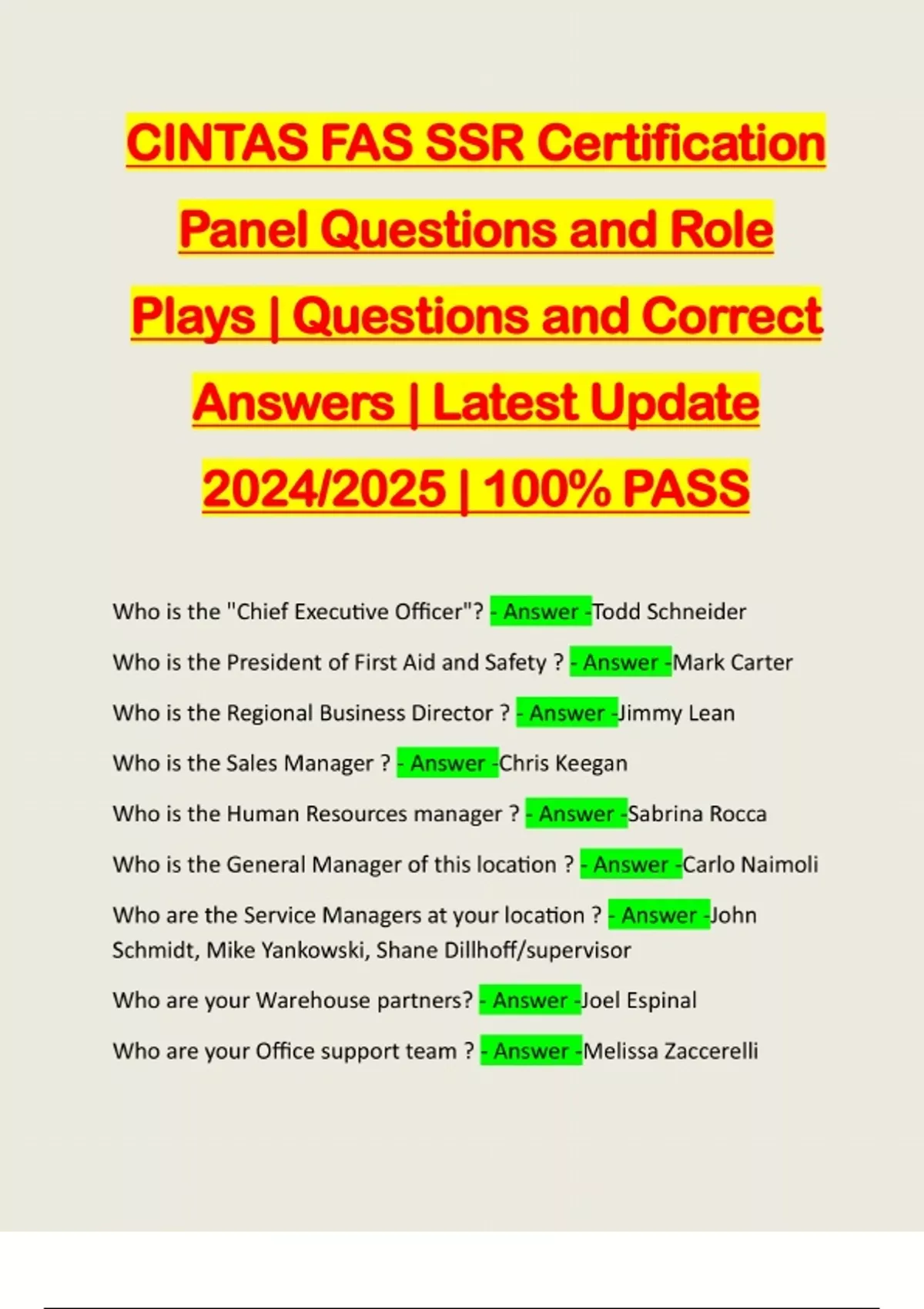 CINTAS FAS SSR Certification Panel Questions and Role Plays | Questions and Correct Answers | Latest Update 2024/2025 | 100% PASS Who is the "Chief Executive Officer"? - Answer -Todd Schneider Who is the President of First Aid and Safety ? - Answer -Mark Carter Who is the Regional Business Director ? - Answer -Jimmy Lean Who is the Sales Manager ? - Answer -Chris Keegan Who is the Human Resources manager ? - Answer -Sabrina Rocca Who is the General Manager of this location ? - Answer -Carlo Naimoli Who are the Service Managers at your location ? - Answer -John Schmidt, Mike Yankowski, Shane Dillhoff/supervisor Who are your Warehouse partners? - Answer -Joel Espinal Who are your Office support team ? - Answer -Melissa ZaccerelliWhat is the Principal objective ? (verbatim) - An