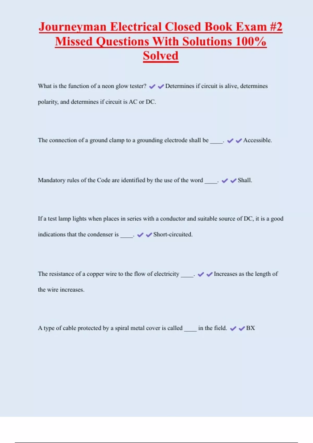 Journeyman Electrical Closed Book Exam #2 Missed Questions With Solutions 100% Solved What is the function of a neon glow tester? Determines if circuit is alive, determines polarity, and determines if circuit is AC or DC. The connection of a ground clamp to a grounding electrode shall be ____. Accessible. Mandatory rules of the Code are identified by the use of the word ____. Shall. If a test lamp lights when places in series with a conductor and suitable source of DC, it is a good indications that the condenser is ____. Short-circuited. The resistance of a copper wire to the flow of electricity ____. Increases as the length of the wire increases