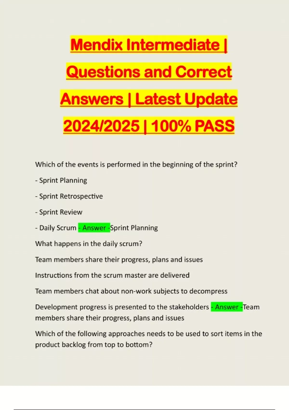 Mendix Intermediate | Questions and Correct Answers | Latest Update 2024/2025 | 100% PASS Which of the events is performed in the beginning of the sprint? - Sprint Planning - Sprint Retrospective - Sprint Review - Daily Scrum - Answer -Sprint Planning What happens in the daily scrum? Team members share their progress, plans and issues Instructions from the scrum master are delivered Team members chat about non-work subjects to decompress Development progress is presented to the stakeholders - Answer -Team members share their progress, plans and issues Which of the following approaches needs to be used to sort items in the product backlog from top to bottom?Based on the ID assigned to a user story. Based on an estimation of time development of a user story might take. Based on the descending priority. Based on an estimation of effort associated with a user story. - Answer - Based on descending priority