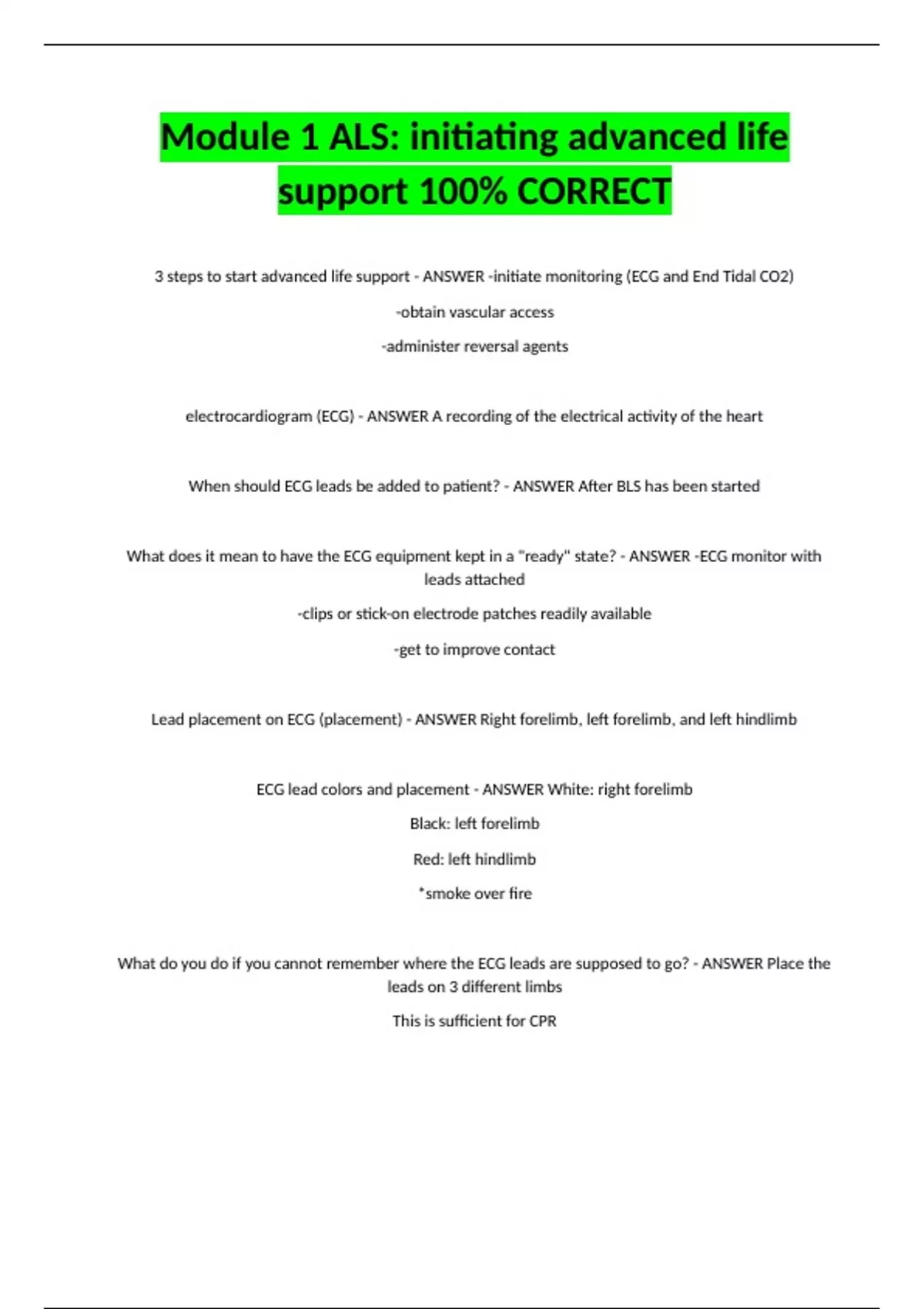 3 steps to start advanced life support - ANSWER -initiate monitoring (ECG and End Tidal CO2) -obtain vascular access -administer reversal agents electrocardiogram (ECG) - ANSWER A recording of the electrical activity of the heart When should ECG leads be added to patient? - ANSWER After BLS has been started