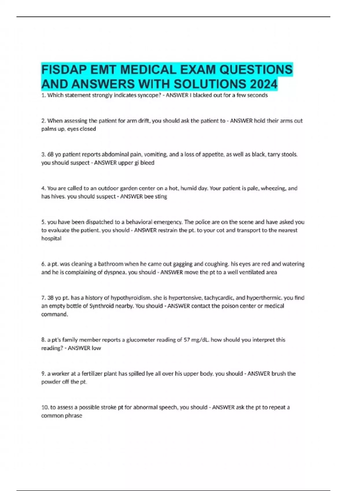 FISDAP EMT MEDICAL EXAM QUESTIONS AND ANSWERS WITH SOLUTIONS 2024