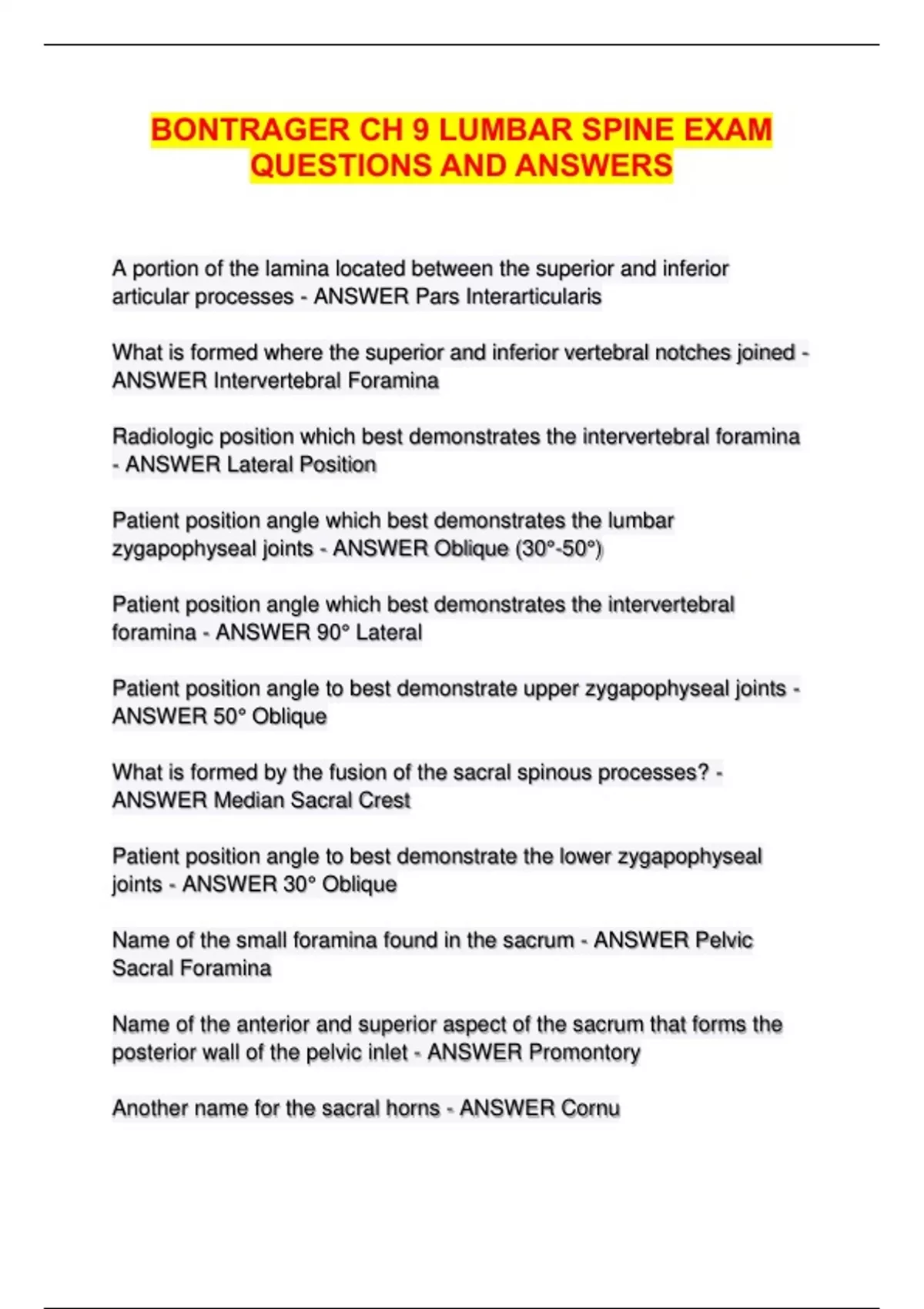 BONTRAGER CH 9 LUMBAR SPINE EXAM QUESTIONS AND ANSWERS...