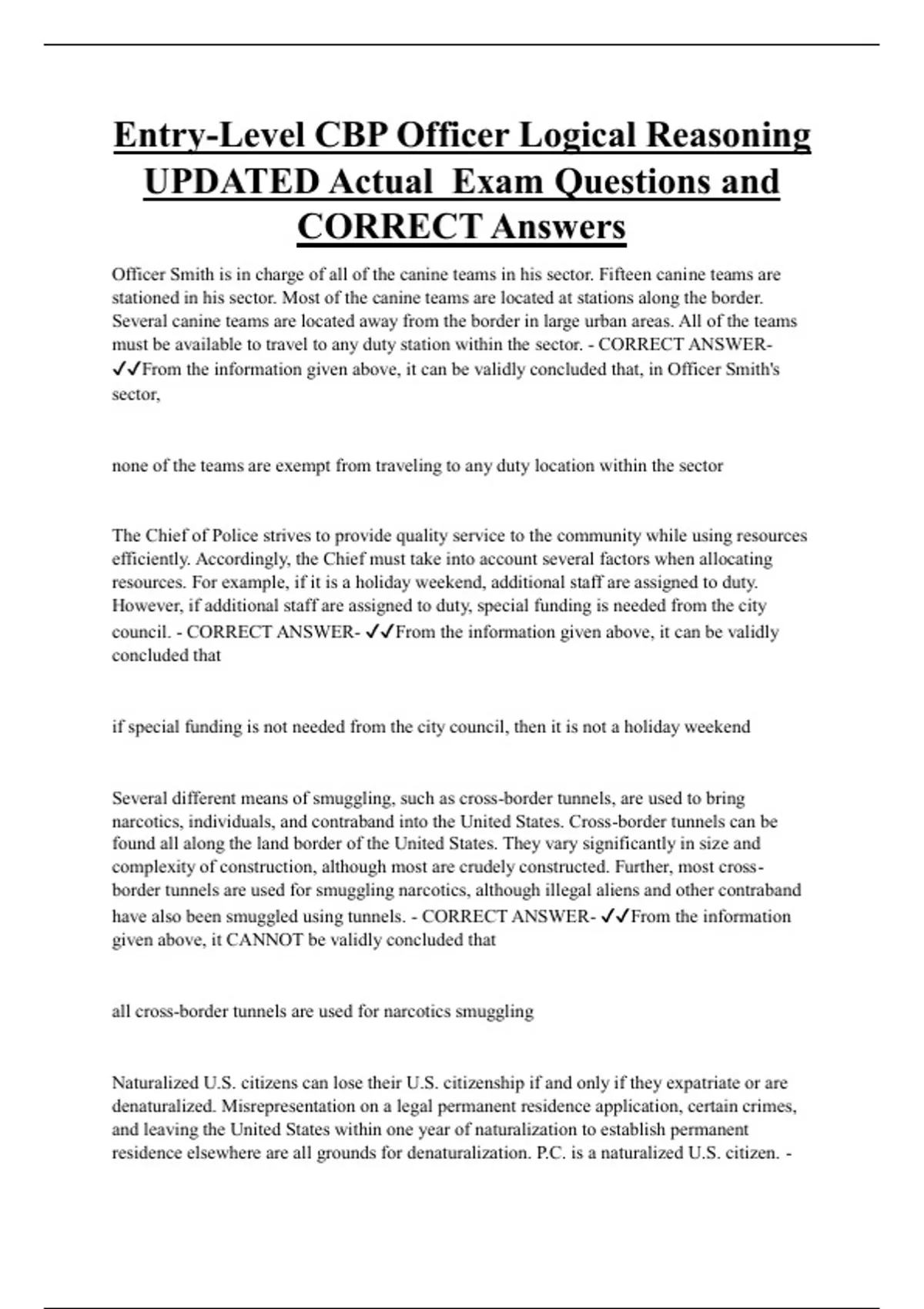 Entry-Level CBP Officer Logical Reasoning UPDATED Actual Exam Questions and CORRECT Answers Officer Smith is in charge of all of the canine teams in his sector. Fifteen canine teams are stationed in his sector. Most of the canine teams are located at stations along the border. Several canine teams are located away from the border in large urban areas. All of the teams must be available to travel to any duty station within the sector. - CORRECT ANSWER- From the information given above, it can be validly concluded that, in Officer Smith's sector,