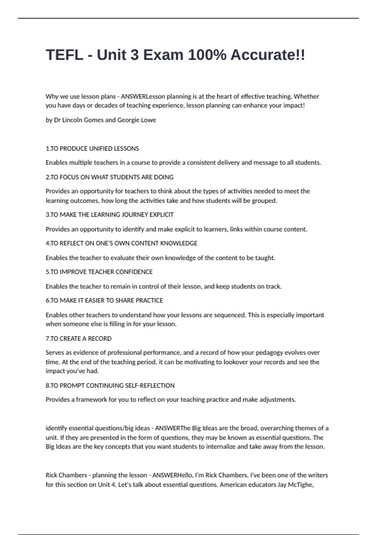 Why we use lesson plans - ANSWERLesson planning is at the heart of effective teaching. Whether you have days or decades of teaching experience, lesson planning can enhance your impact! by Dr Lincoln Gomes and Georgie Lowe 1.TO PRODUCE UNIFIED LESSONS Enables multiple teachers in a course to provide a consistent delivery and message to all students. 2.TO FOCUS ON WHAT STUDENTS ARE DOING Provides an opportunity for teachers to think about the types of activities needed to meet the learning outcomes, how long the activities take and how students will be grouped. 3.TO MAKE THE LEARNING JOURNEY EXPLICIT Provides an opportunity to identify and make explicit to learners, links within course content. 4.TO REFLECT ON ONE'S OWN CONTENT KNOWLEDGE Enables the teacher to evaluate their own knowledge of the content to be taught. 5.TO IMPROVE TEACHER CONFIDENCE Enables the teacher to remain in control of their lesson, and keep students on track. 6.TO MAKE IT EASIER TO SHARE PRACTICE Enables other teachers to understand how your lessons are sequenced. This is especially important when someone else is filling in for your lesson. 7.TO CREATE A RECORD Serves as evidence of professional performance, and a record of how your pedagogy evolves over time. At the end of the teaching period, it can be motivating to lookover your records and see the impact you've had. 8.TO PROMPT CONTINUING SELF-REFLECTION Provides a framework for you to reflect on your teaching practice and make adjustments. identify essential questions/big ideas - ANSWERThe Big Ideas are the broad, overarching themes of a unit. If they are presented in the form of questions, they may be known as essential questions. The Big Ideas are the key concepts that you want students to internalize and take away from the lesson.