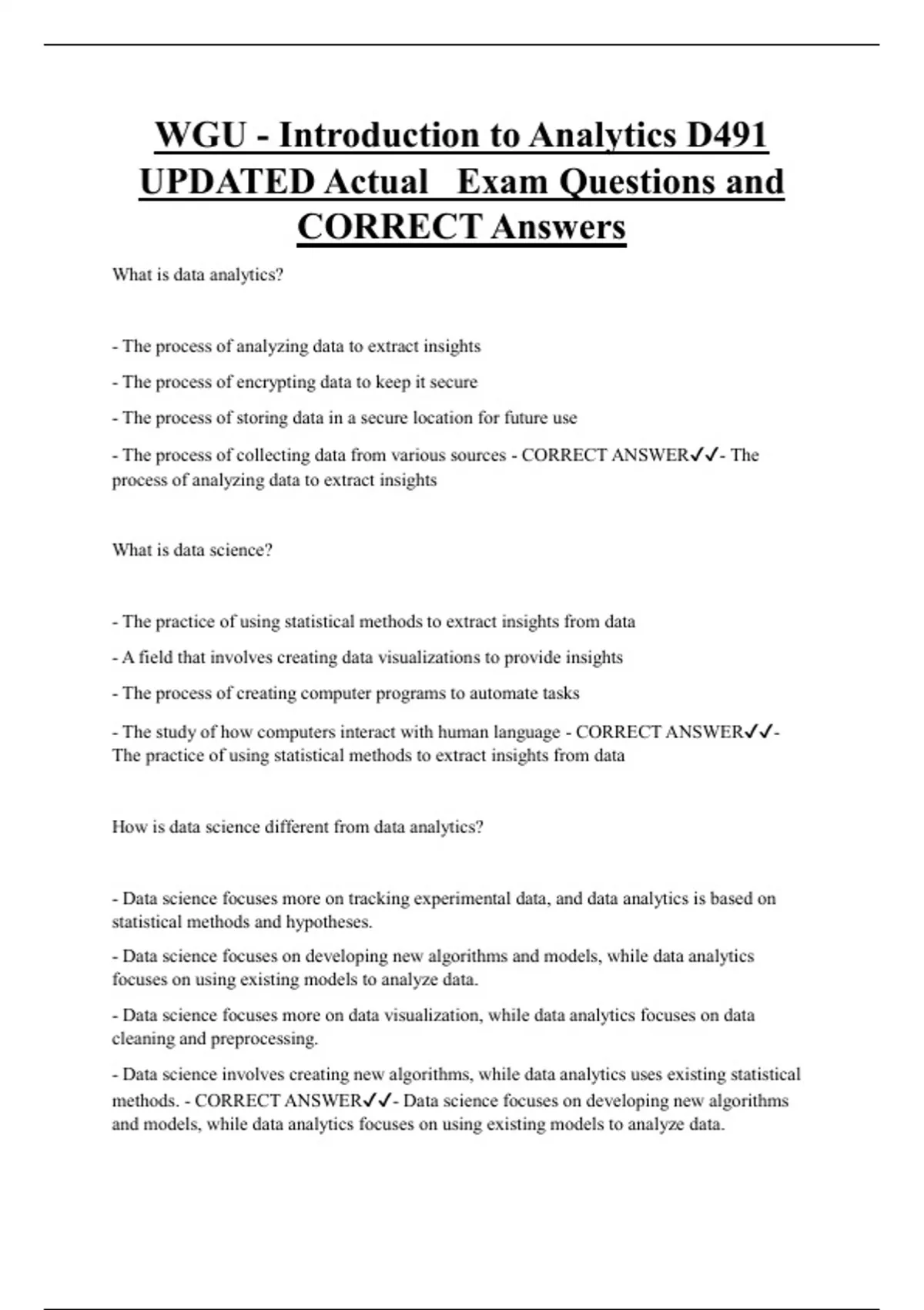 WGU - Introduction to Analytics D491 UPDATED Actual Exam Questions and CORRECT Answers What is data analytics? - The process of analyzing data to extract insights - The process of encrypting data to keep it secure - The process of storing data in a secure location for future use - The process of collecting data from various sources - CORRECT ANSWER- The process of analyzing data to extract insights