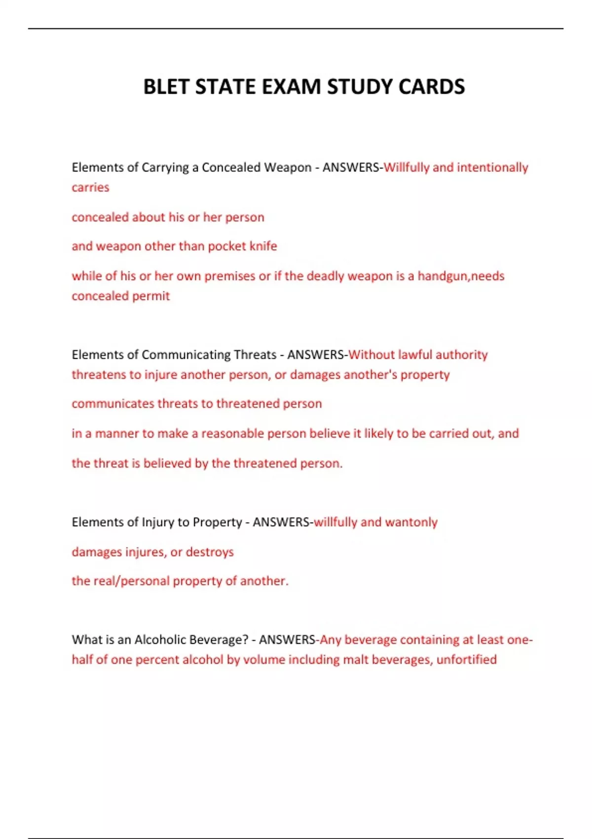 BLET STATE EXAM STUDY CARDS QUESTIONS AND ANSWERS 2024