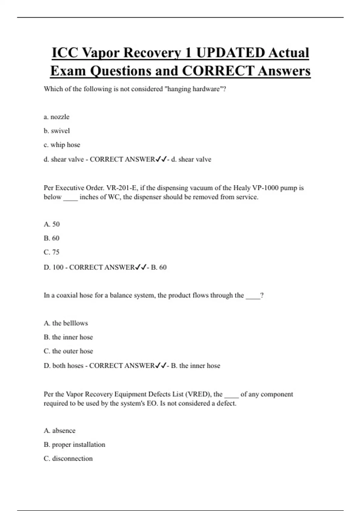 ICC Vapor Recovery 1 UPDATED Actual Exam Questions and CORRECT Answers Which of the following is not considered "hanging hardware"? a. nozzle b. swivel c. whip hose d. shear valve - CORRECT ANSWER- d. shear valve