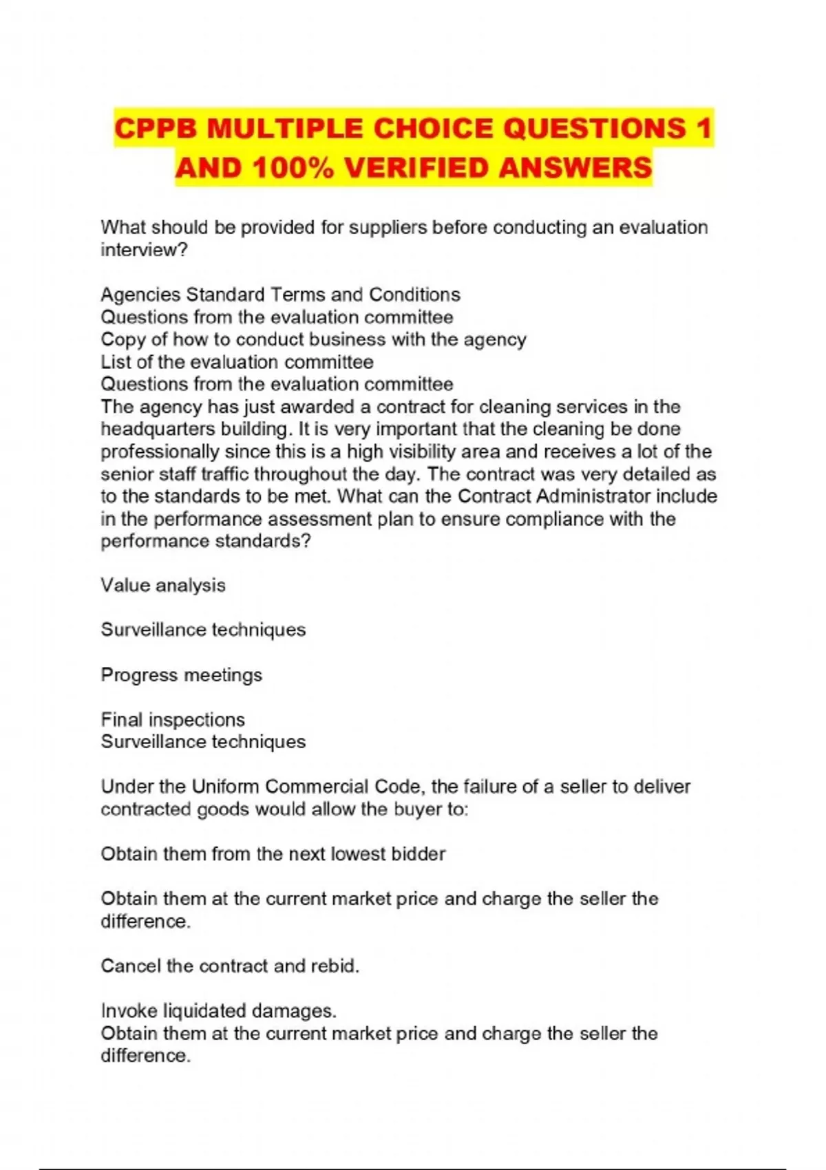 CPPB MULTIPLE CHOICE QUESTIONS 1 AND 100% VERIFIED ANSWERS