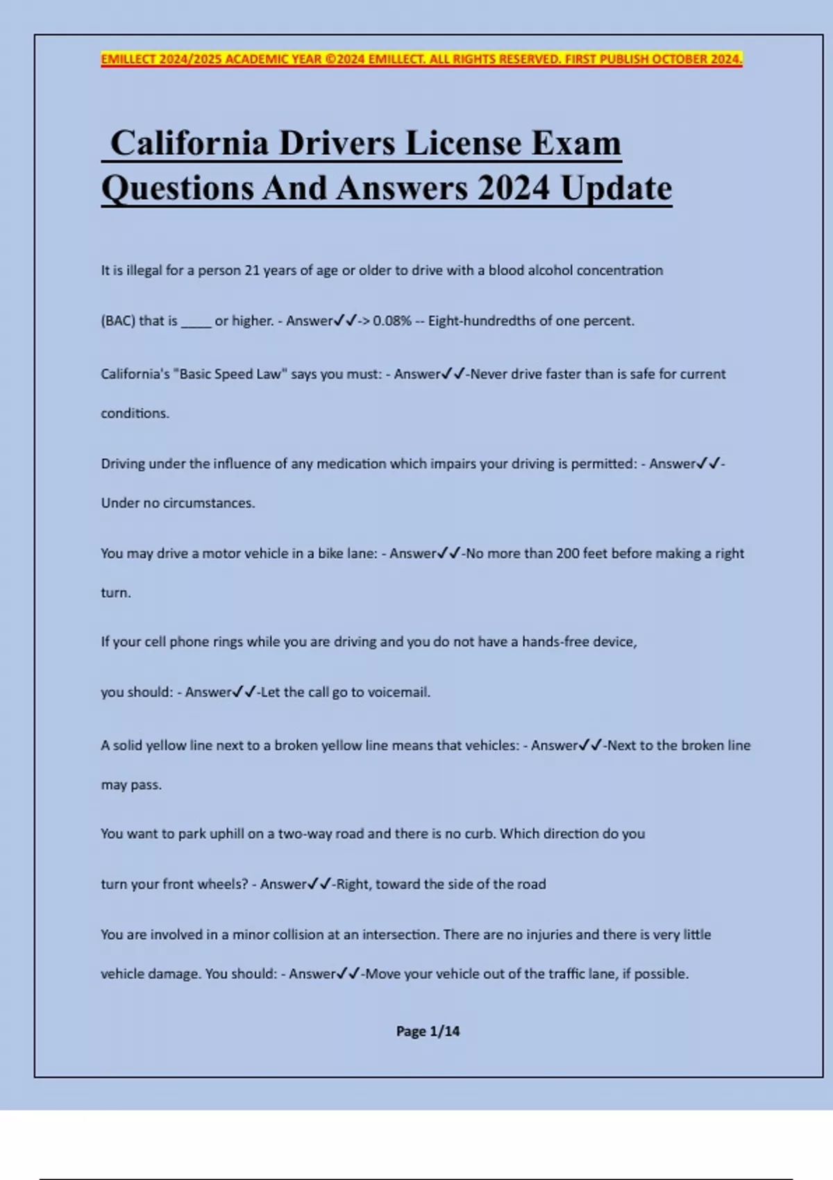 California Drivers License Exam Questions And Answers 2024 Update It is illegal for a person 21 years of age or older to drive with a blood alcohol concentration (BAC) that is ____ or higher. - Answer- 0.08% -- Eight-hundredths of one percent. California's "Basic Speed Law" says you must: - Answer-Never drive faster than is safe for current conditions. Driving under the influence of any medication which impairs your driving is permitted: - Answer- Under no circumstances. You may drive a motor vehicle in a bike lane: - Answer-No more than 200 feet before making a right turn. If your cell phone rings while you are driving and you do not have a hands-free device, you should: - Answer-Let the call go to voicemail. A solid yellow line next to a broken yellow line means that vehicles: - Answer-Next to the broken line may pass. You want to park uphill on a two-way road and there is no curb. Which direction do you turn your front wheels? - Answer-Right, toward the side of the road You are involved in a minor collision at an intersection. There are no injuries and there is very little vehicle damage. You should: - Answer-Move your vehicle out of the traffic lane, if possible. EMILLECT 2024/2025 ACADEMIC YEAR ©2024 EMILLECT. ALL RIGHTS RESERVED. FIRST PUBLISH OCTOBER 2024. Page 2/14 Smoking inside a vehicle with a person younger than 18 years of age is: - Answer-Illegal at all times. If there is no crosswalk and you see a pedestrian crossing your lane, you should: - Answer-Stop and let the pedestrian finish crossing. You are driving on the freeway behind a large truck. You should drive: - Answer-Farther behind the truck than you would if following a passenger vehicle. You must yield to a pedestrian using a white cane or guide dog: - Answer-At all times. To see vehicles in your blind spots, you should check: - Answer-Over your shoulders. You are on the freeway and traffic is merging into your lane. You should: - Answer-Make room for the merging traffic, if possible. If a traffic signal light is not working, you must: - Answer-Stop, then proceed when safe. Extra space in front of a large truck is needed for: - Answer-The truck driver to stop the vehicle. When passing another vehicle, it is safe to return to your lane if you: - Answer-See the vehicle's headlights in your rearview mirror. You consent to take a chemical test for the alcohol content of your blood, breath, or urine: - Answer-Whenever you drive in California. When driving at night on a dimly lit street, you should: - Answer-Drive slowly enough that you can stop within the area illuminated by your headlights. You may drive off of the paved roadway to pass another vehicle: - Answer
