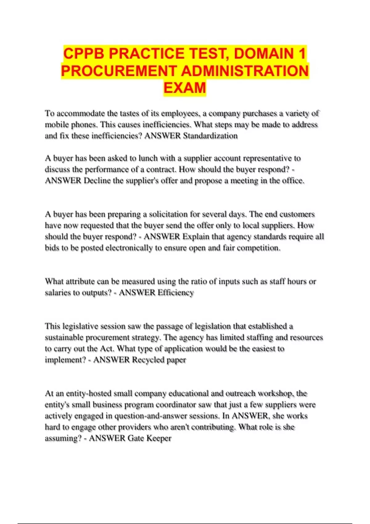 CPPB PRACTICE TEST, DOMAIN 1 PROCUREMENT ADMINISTRATION EXAM...