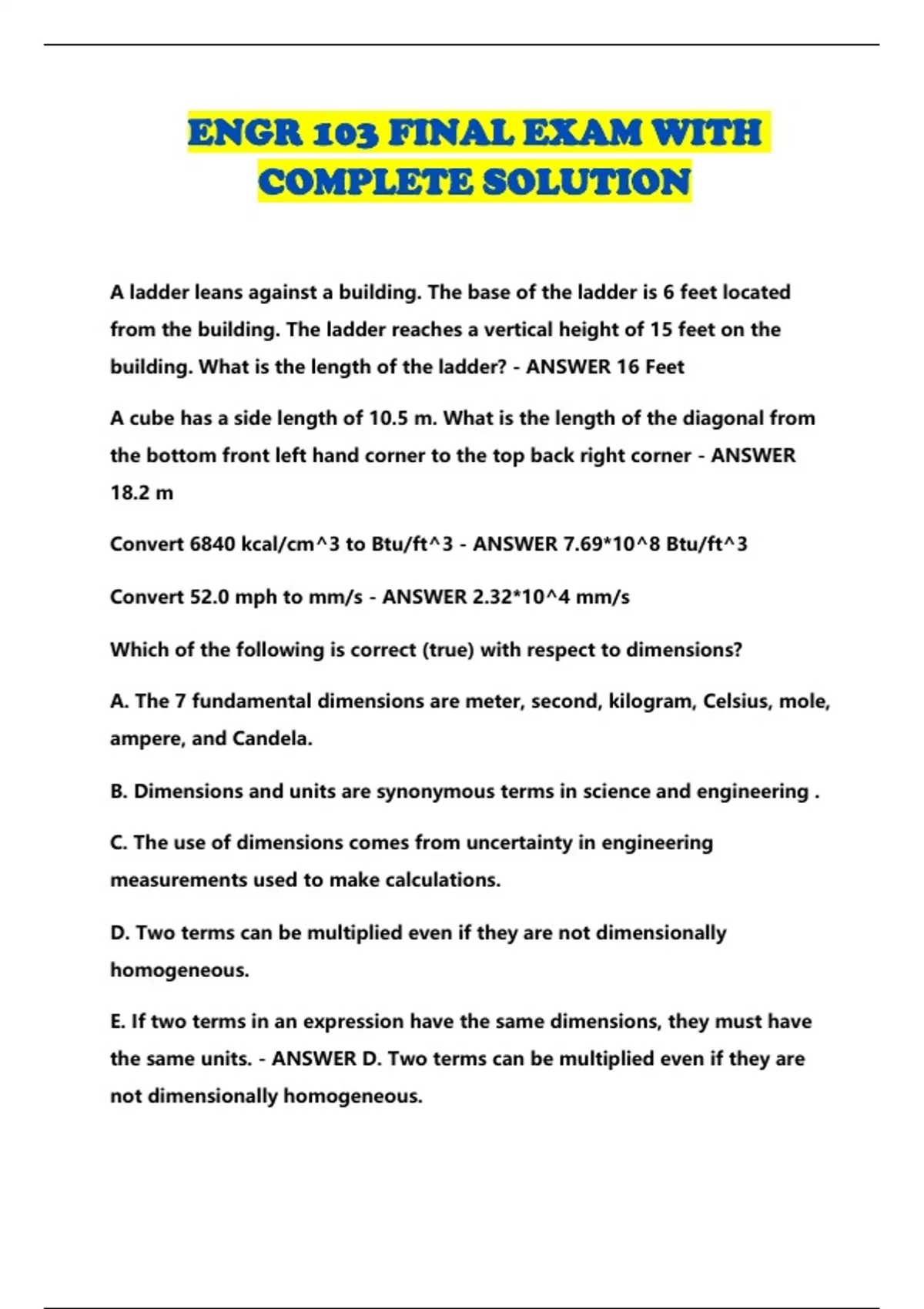 ENGR 103 FINAL EXAM WITH COMPLETE SOLUTION