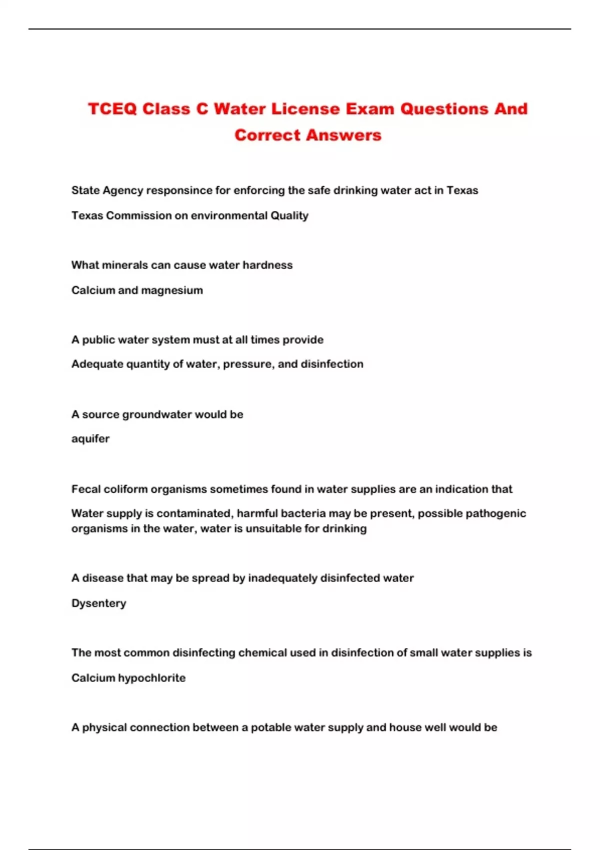 TCEQ Class C Water License Exam Questions And Correct Answers