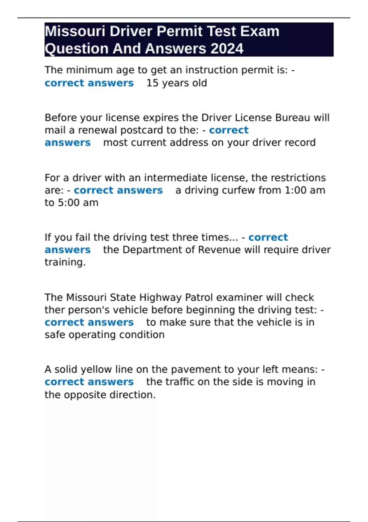 Missouri Driver Permit Test Exam Question And Answers 2024